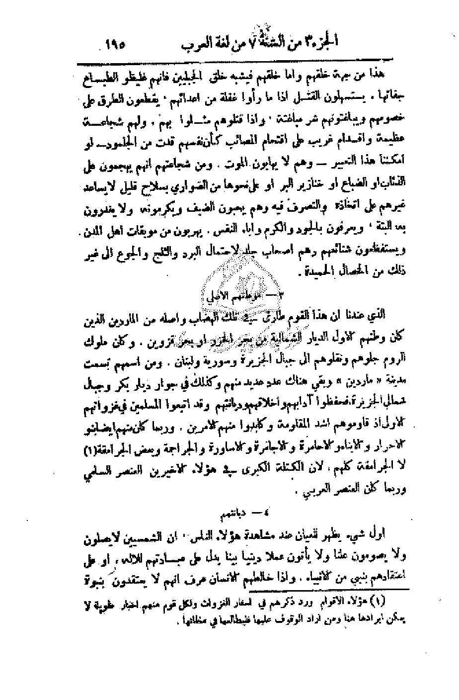 الذي عندنا أن هذا القوم طارئ في تلك الهضاب وأصله من الماردين الذين كان وطنهم الأول الديار الشمالية من بحر الخزر أو بحر قزوين. وكان ملوك الروم جلوهم ونقلوهم إلى جبال الجزيرة وسورية ولبنان. ومن اسمهم تسمت مدينة (ماردين) وبقي هناك عدد منهم وكذلك في جوار ديار بكر وجبال شمالي الجزيرة، فحفظوا آدابهم وأخلاقهم وديانتهم وقد اتبعوا المسلمين في غزواتهم فحفظوا آدابهم وأخلاقهم وديانتهم وقد أتبعوا المسلمين في غزواتهم الأولى إذ قاوموهم أشد المقاومة وكابدوا منهم الأمرين. وربما كان منهم أيضا بنو الأحرار والأبناء والأحامرة والأجامرة والأساورة والجراجمة وبعض الجرامقة لا الجرامقة