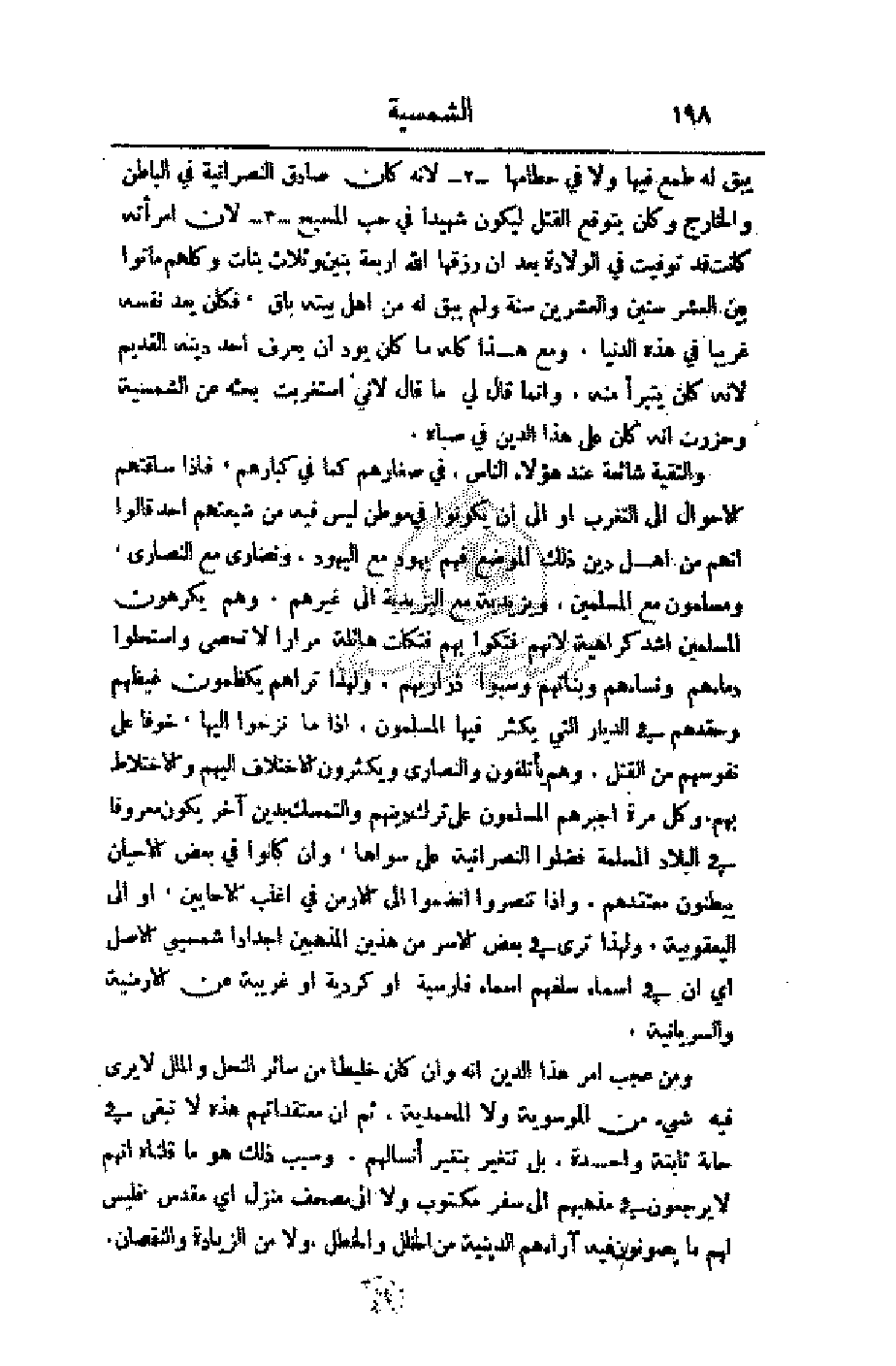 يبق له طمع فيها ولا في حطامها - 2 - لأنه كان صادق النصرانية في الباطن والخارج وكان يتوقع القتل ليكون شهيداً في حب المسيح - 3 - لأن امرأته كانت قد وفيت في الولادة بعد أن رزقها الله أربعة بنين وثلاث بنات وكلهم ماتوا بين العشر سنين والعشرين سنة ولم يبق له من أهل بيته باق، فكان يعد نفسه غريبا في هذه الدنيا. ومع هذا كله ما كان يود أن يعرف أحد دينه القديم لأنه كان يتبرأ منه، وإنما قال لي ما قال لأني استغربت بحثه عن الشمسية وحزرت أنه كان على هذا الدين في صباه.