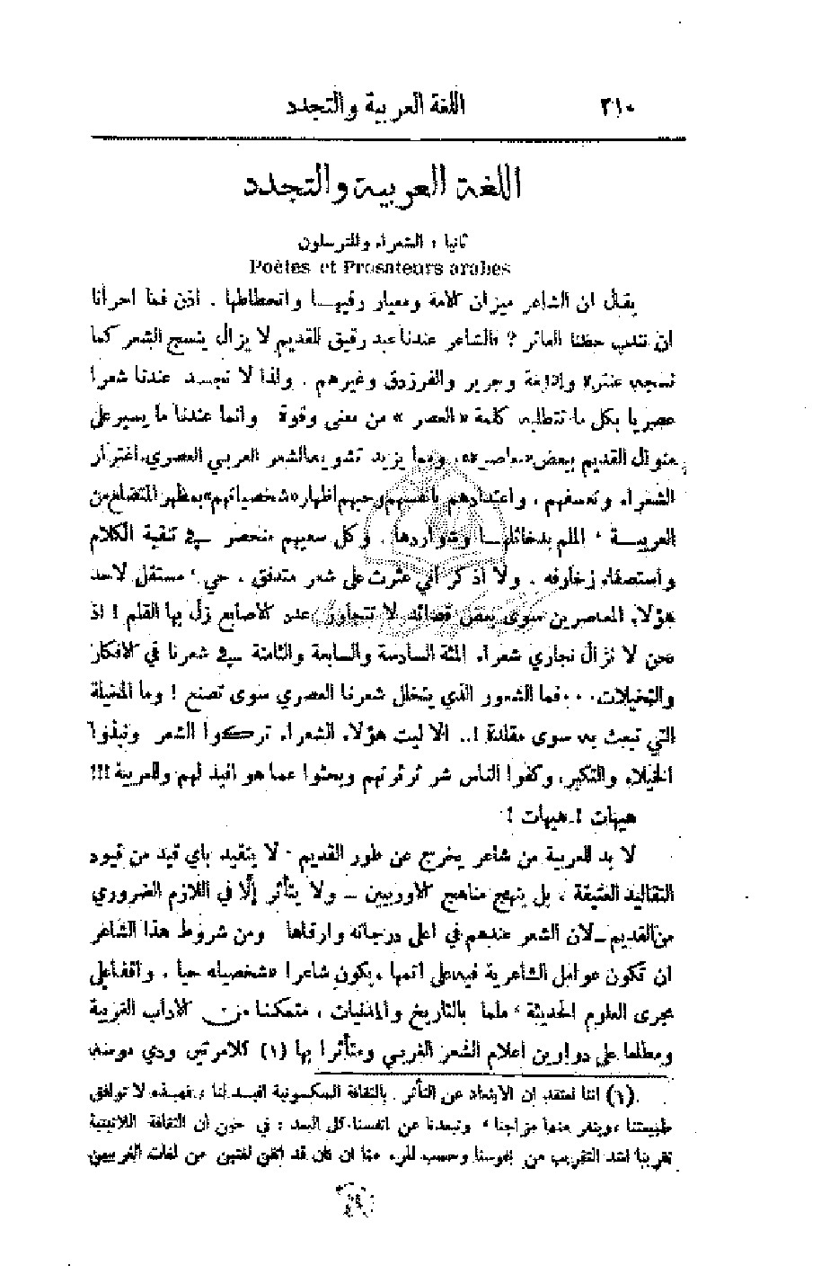 لا بد للعربية من شاعر يخرج عن طور القديم، لا يتقيد بأي قيد من قيود التقاليد العتيقة، بل ينهج مناهج الأوربيين - ولا يتأثر إلاّ في اللازم الضروري من القديم - لأن الشعر عندهم في أعلى درجاته وأرقاها. ومن شروط هذا الشاعر أن تكون عوامل الشاعرية فيه على أتمها، يكون شاعرا (شخصيا) حيا، واقفا على مجرى العلوم الحديثة، ملما بالتاريخ والمدنيات، متمكنا من الآداب الغربية ومطلعاً على دواوين إعلام الشعر الغربي ومتأثرا بها كلامرتين ودي موسه