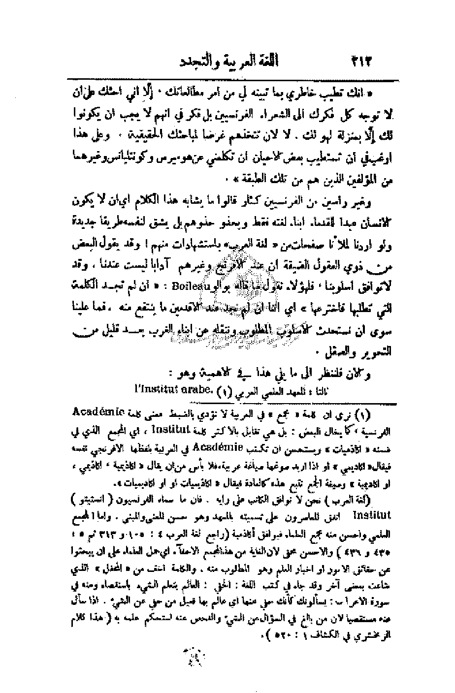 وغير راسين من الفرنسيين كثار قالوا ما يشابه هذا الكلام أي أن لا يكون الإنسان عبدا للقدماء أبناء لغته فقط ويحذو حذوهم بل يشق لنفسه طريقا جديدة ولو أردنا لملأنا صفحات من (لغة العرب) باستشهادات منهم! وقد يقول البعض من ذوي العقول الضيقة أن عند الإفرنج وغيرهم آدابا ليست عندنا، وقد لا توافق أسلوبنا، فلهؤلاء نقول ما قاله بوالو (إن لم تجد الكلمة التي تطلبها فأخترعها) أي أننا إن لم نجد عند الأقدمين ما ينتفع منه، فما علينا سوى أن نستحدث الأسلوب المطلوب وننقله عن أبناء الغرب بعد قليل من التحوير