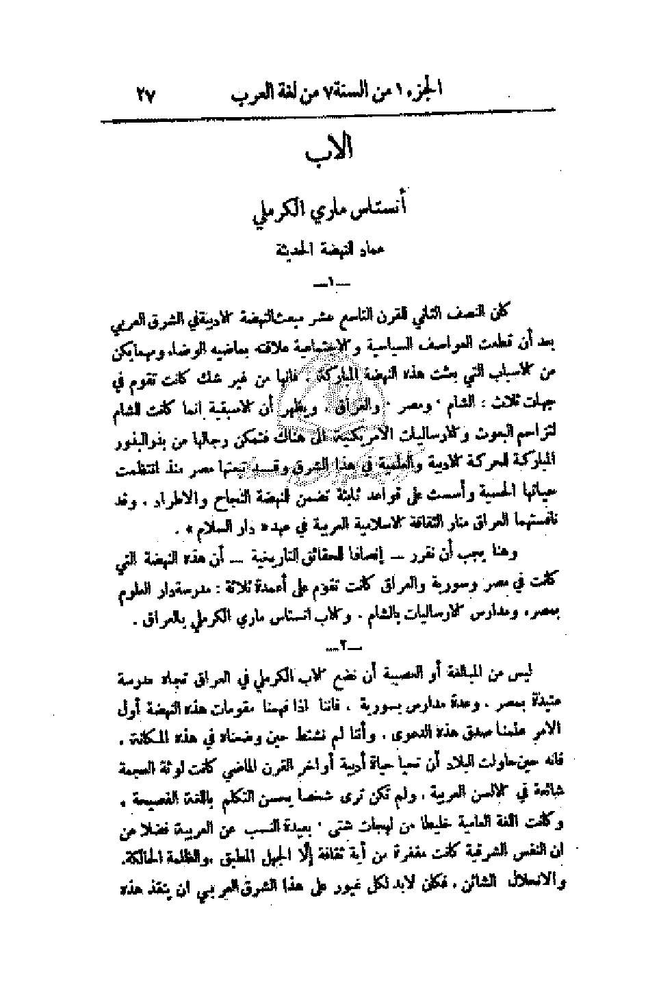 وهنا يجب أن نقرر - إنصافا للحقائق التاريخية - أن هذه النهضة التي كانت في مصر وسورية والعراق كانت تقوم على أعمدة ثلاثة: مدرسة دار العلوم بمصر، ومدارس الإرساليات بالشام. والأب أنستاس ماري الكرملي بالعراق.