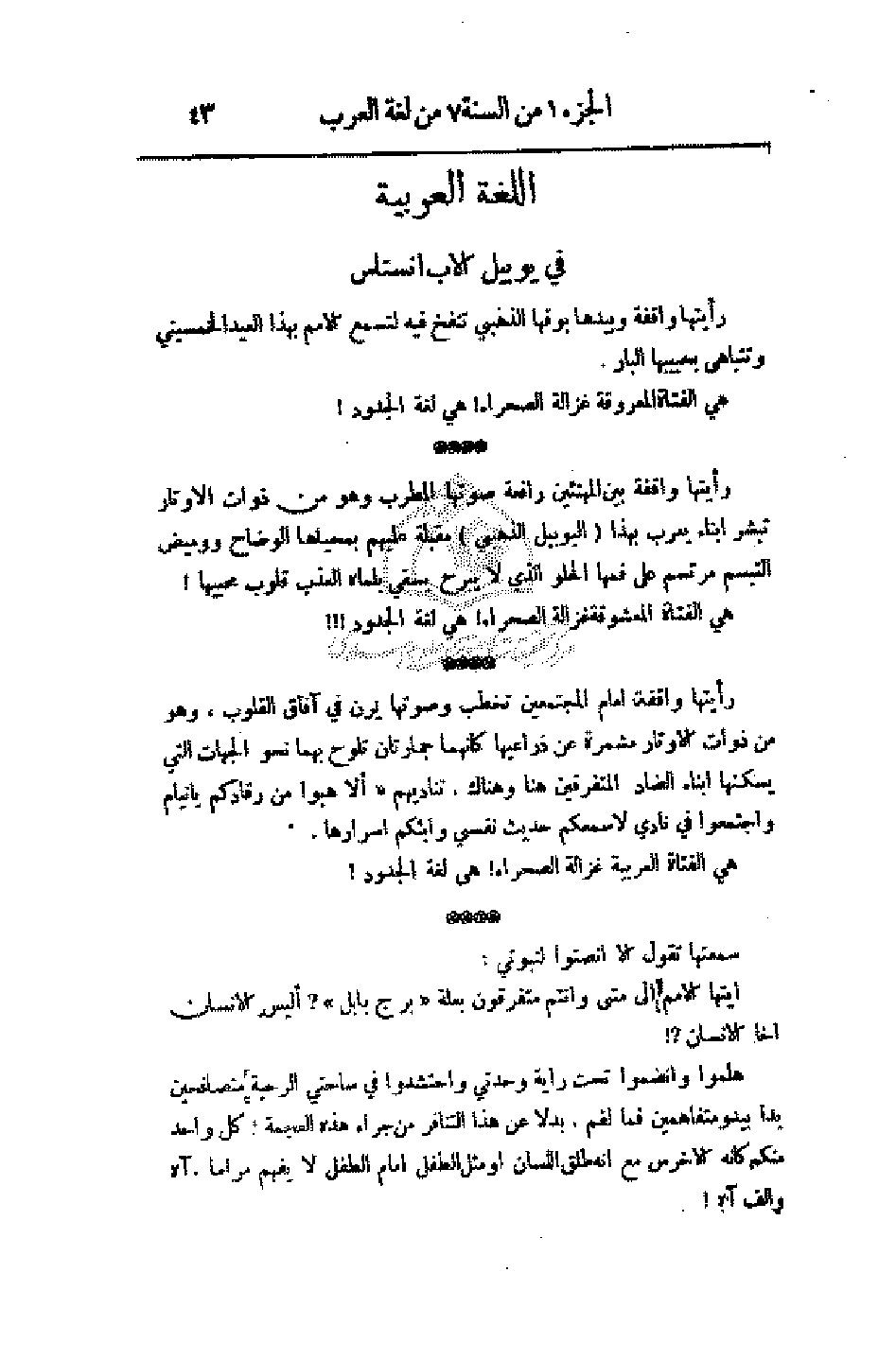 رأيتها واقفة أمام المجتمعين تخطب وصوتها يرن في آفاق القلوب، وهو من ذوات الأوتار مشمرة عن ذراعيها كأنهما جمارتان تلوح بهما نحو الجهات التي يسكنها أبناء الضاد المتفرقين هنا وهناك، تناديهم (ألا هبوا من رقادكم يا نيام واجتمعوا في نادي لأسمعكم حديث نفسي وأبثكم أسرارها.