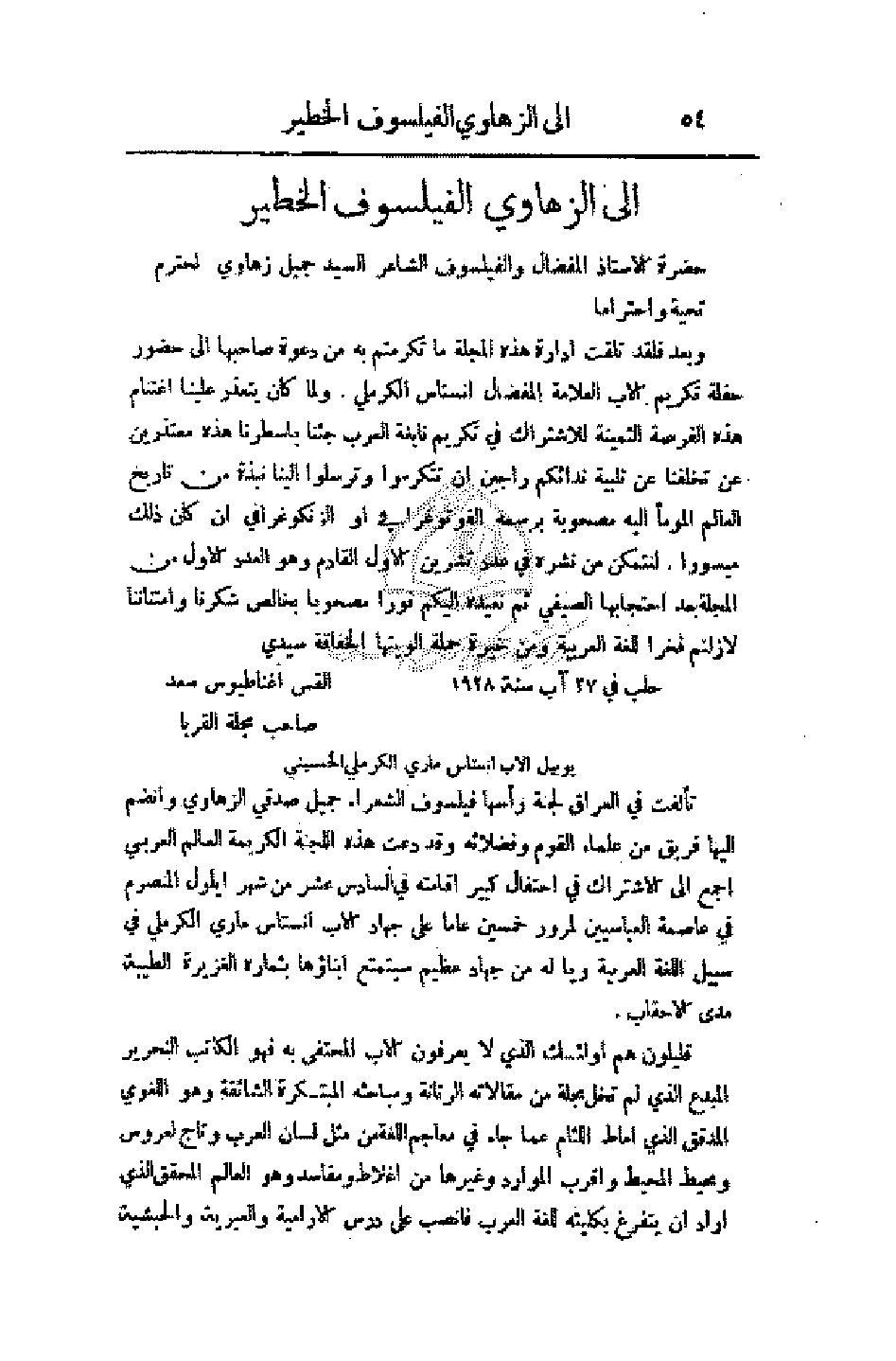 وبعد فلقد تلقت إدارة هذه المجلة ما تكرمتم به من دعوة صاحبها إلى حضور حفلة تكريم الأب العلامة المفضال انستاس الكرملي. ولما كان يتعذر علينا اغتنام هذه الفرصة الثمينة للاشتراك في تكريم نابغة العرب جئنا بأسطرنا هذه معتذرين عن تخلفنا عن تلبية ندائكم راجين أن تتكرموا وترسلوا إلينا نبذة من تاريخ العالم المومأ إليه مصحوبة برسمه الفوتوغرافي أو الزنكوغرافي إن كان ذلك ميسورا. لنتمكن من نشره في عدد تشرين الأول القادم وهو العدد الأول من المجلة بعد احتجابها الصيفي ثم نعيده إليكم فورا مصحوبا بخالص شكرنا وامتناننا لازلتم فخرا للغة العربية ومن خيرة حملة ألويتها الخفافة سيدي