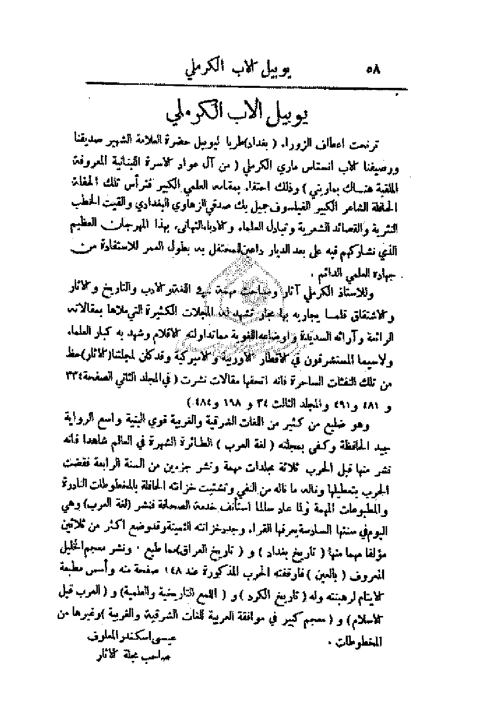 ترنحت أعطاف الزوراء (بغداد) طربا ليوبيل حضرة العلامة الشهير صديقنا ورصيفنا الأب أنستاس ماري الكرملي (من آل عواد الأسرة اللبنانية المعروفة الملقبة هناك بماريني) وذلك احتفاء بمقامه العلمي الكبير فترأس تلك الحفلة الحافلة الشاعر الكبير الفيلسوف جميل بك صدقي الزهاوي البغدادي وألقيت الخطب النثرية والقصائد الشعرية وتبادل العلماء والأدباء التهاني بهذا المهرجان العظيم الذي نشاركهم فيه على بعد الديار داعين للمحتفل به بطول العمر للاستفادة من جهاده العلمي الدائم.
