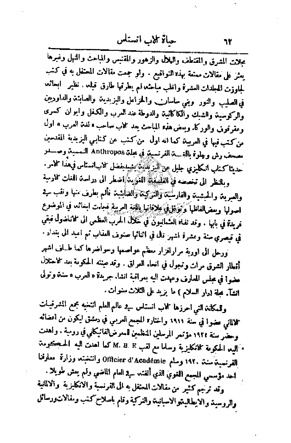 مجلات المشرق والمقتطف والهلال والزهور والمقتبس والمباحث والمنهل وغيرها يعثر على مقالات ممتعة بهذه التواقيع. ولو جمعت مقالات المحتفل به في كتب لجاوزت المجلدات العشرة وأغلب مباحثه لم يطرقها طارق قبله، نظير أبحاثه في الصليب والنور وبني ساسان والخزاعل واليزيدية والصابئة والداوديين والركوسية والشبك والكاكائية والدوطة عند العرب والكفل وإيوان كسرى وعقرقوف والوركاء وبعض هذه المباحث يعد الأب صاحب (لغة العرب) أول من كتب فيها في العربية كما أنه أول من كتب عن كتابي اليزيدية المقدسين مصحف رش وجلوة باللغة الفرنسية في مجلة النمسية وصدر حديثا