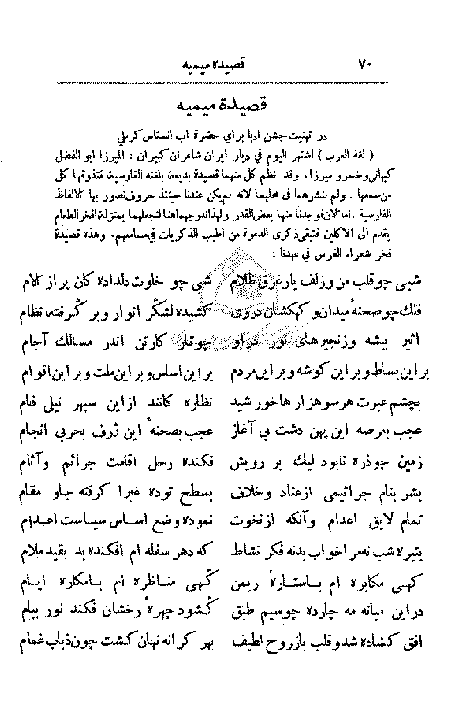 (لغة العرب) اشتهر اليوم في ديار إيران شاعران كبيران: الميرزا أبو الفضل كيهاني وخسرو ميرزا. وقد نظم كل منهما قصيدة بديعة بلغته الفارسية فتذوقها كل من سمعها. ولم ننشرهما في محلهما لأنه لم يكن عندنا حينئذ حروف نصور بها الألفاظ الفارسية. أما الآن فوجدنا منها بعض القدر ولهذا ندرجهما هنا لنجعلهما بمنزلة أفخر الطعام يقدم إلى الآكلين فتبقى ذكرى الدعوة من أطيب الذكريات في مسامعهم. وهذه قصيدة فخر شعراء الفرس في عهدنا: