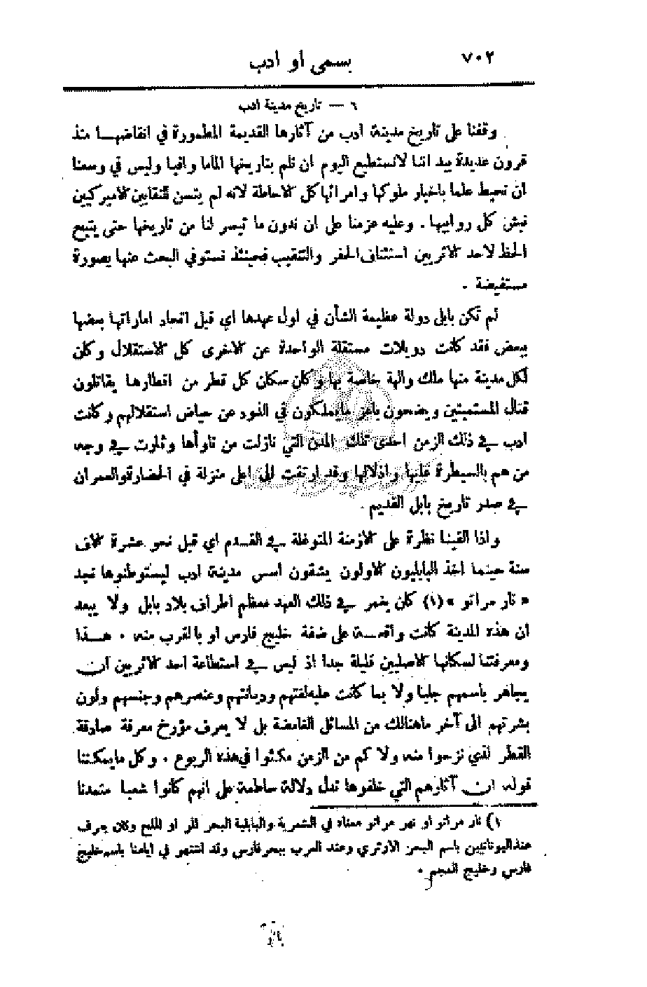 وإذا ألقينا نظرة على الأزمنة المتوغلة في القدم أي قبل نحو عشرة آلاف سنة حينما أخذ البابليون الأولون يشقون أسس مدينة أدب ليستوطنوها نجد (نار مراتو) كان يغمر في ذلك العهد معظم أطراف بلاد بابل ولا يبعد أن هذه المدينة كانت واقعة على ضفة خليج فارس أو بالقرب منه. هذا ومعرفتنا لسكانها الأصليين قليل جدا إذ ليس في استطاعة أحد الأثريين أن يجاهر باسمهم جليا ولا بما كانت عليه لغتهم وديانتهم وعنصرهم وجنسهم ولون بشرتهم إلى آخر ما هنالك من المسائل الغامضة بل لا يعرف مؤرخ معرفة صادقة القطر الذي نزحوا منه ولا كم من الزمن مكثوا في هذه الربوع. وكل ما يمكننا قوله إن آثارهم التي خلفوها تدل دلالة ساطعة على إنهم كانوا شعبا متمدنا