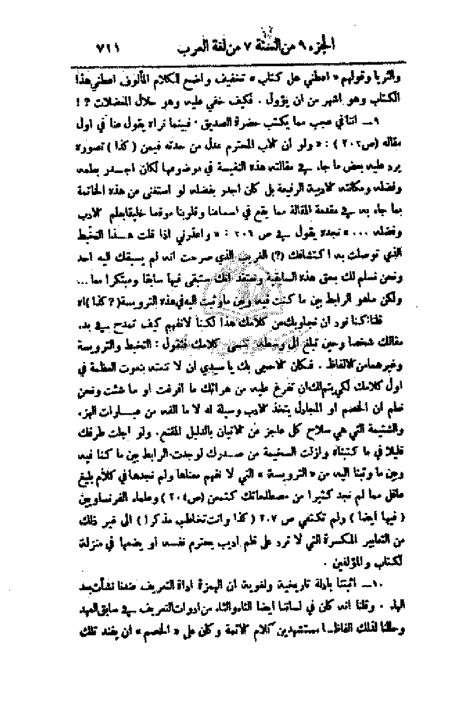 9 - إننا في عجب مما يكتب حضرة الصديق، فبينما نراه يقول عنا في أول مقالة (ص 202): (ولو إن الأب المحترم عدل من حدته فيمن (كذا) تصوره يرد عليه بعض ما جاء في مقالته هذه النفيسة في موضوعها لكان أجدر بعلمه وفضله ومكانته الأدبية الرفيعة بل كان أجدر بفضله لو استغنى عن هذه الخاتمة بما جاء به في مقدمة المقالة مما يقع في أسماعنا وقلوبنا موقعا خليقا بعلم الأدب وفضله. . .) نجده يقول في ص 206: (واعذرني إذا قلت هذا التخبط الذي توصلت به اكتشافك (؟) الغريب الذي صرحت إنه لم يسبقك إليه