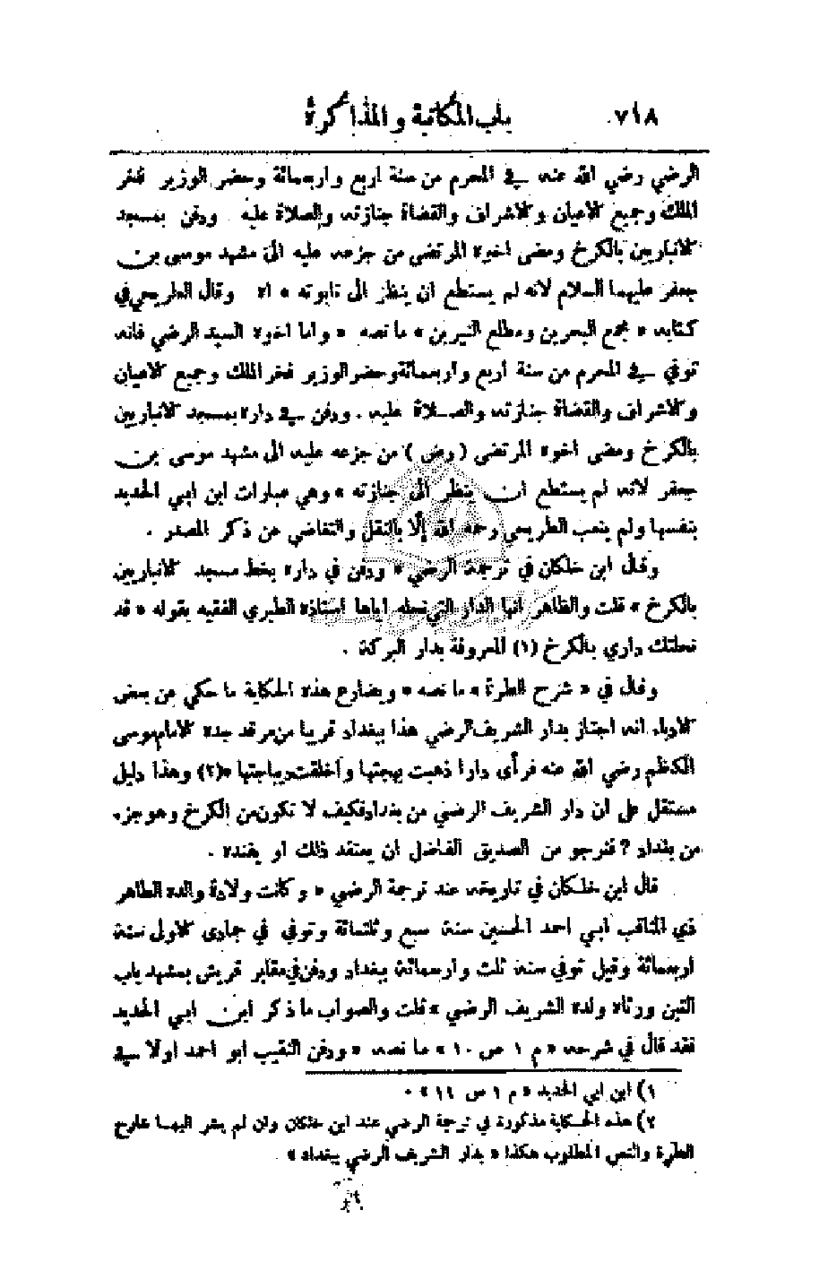 وقال ابن خلكان في ترجمة الرضي (ودفن في داره بخط مسجد الأنباريين بالكرخ) قلت والظاهر أنها الدار التي نحله إياها أستاذه الطبري الفقيه بقوله (قد نحلتك داري بالكرخ المعروفة بدار البركة.