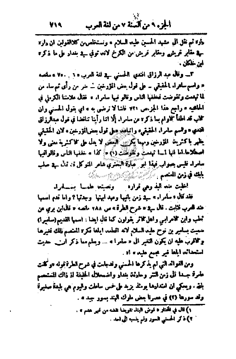 3 - وقال عبد الرزاق أفندي الحسني في لغة العرب (6: 750) ما نصه (واسم سامراء الحقيقي - على قول بعض المؤرخين - سر من رأى ثم ساء من لما تهدمت وتقوضت فخففها الناس وقالوا فيها سامراء) فقال علامتنا الكرملي في الحاشيه) راجع الجزء ص 721 فإننا لا نرضى به) أي بقول الحسني وإن الأب قد أطفأ الأوام بما ذكره عن سامراء إلا أننا رأينا تناقضا في قول عبد الرزاق أفندي (واسم سامراء الحقيقي) وأتباعه (على قول