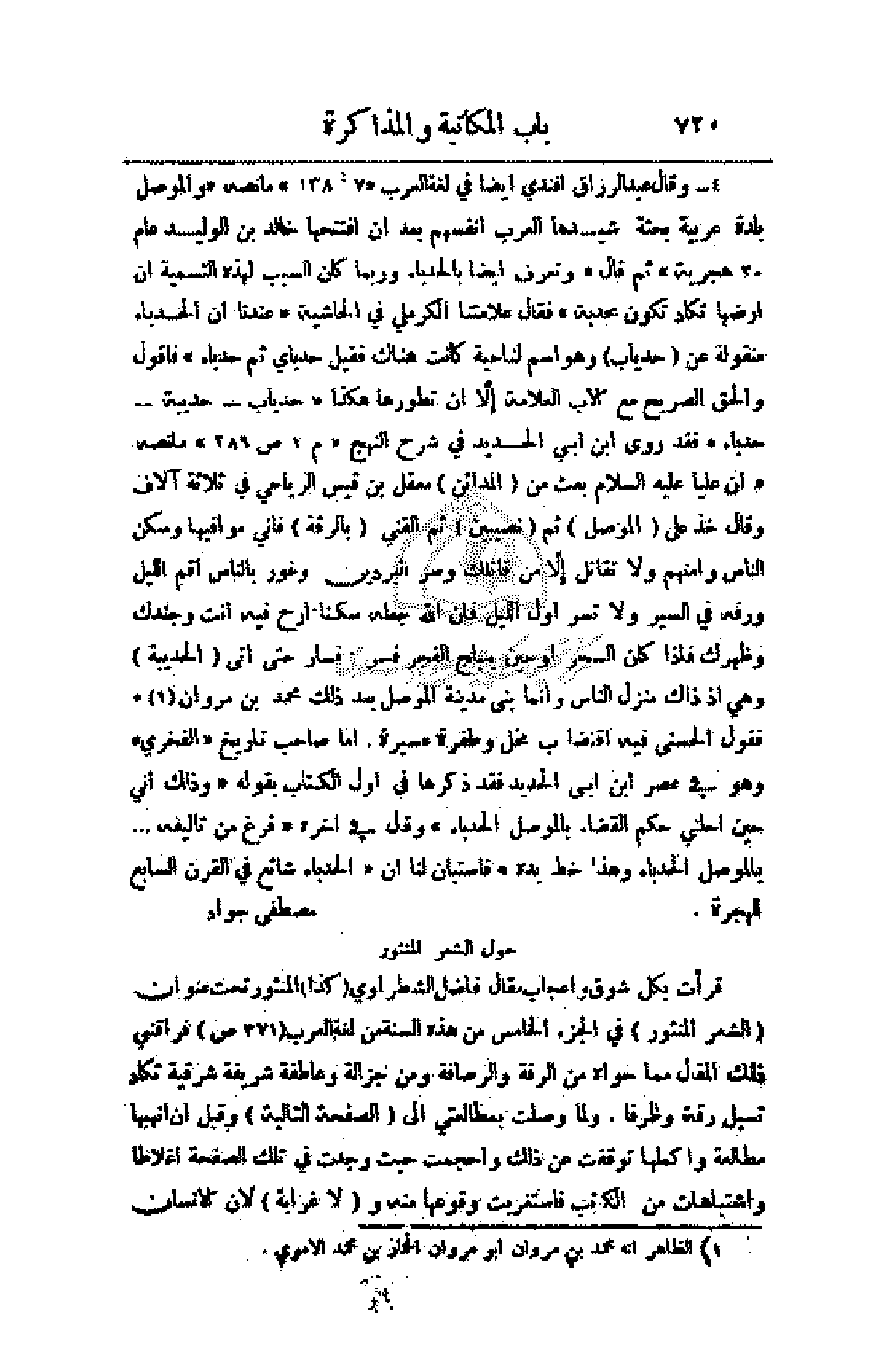 بن مروان. فقول الحسني فيه اقتضاب مخل وطفرة عسيرة. أما صاحب تاريخ (الفخري) وهو في عصر ابن أبى الحديد فقد ذكرها في أول الكتاب بقوله (وذلك إني حين أحلني حكم القضاء بالموصل الحدباء) وقال في آخره (فرغ من تأليفه. . . بالموصل الحدباء وهذا خط يده) فاستبان لنا أن (الحدباء شائع في القرن السابع للهجرة.