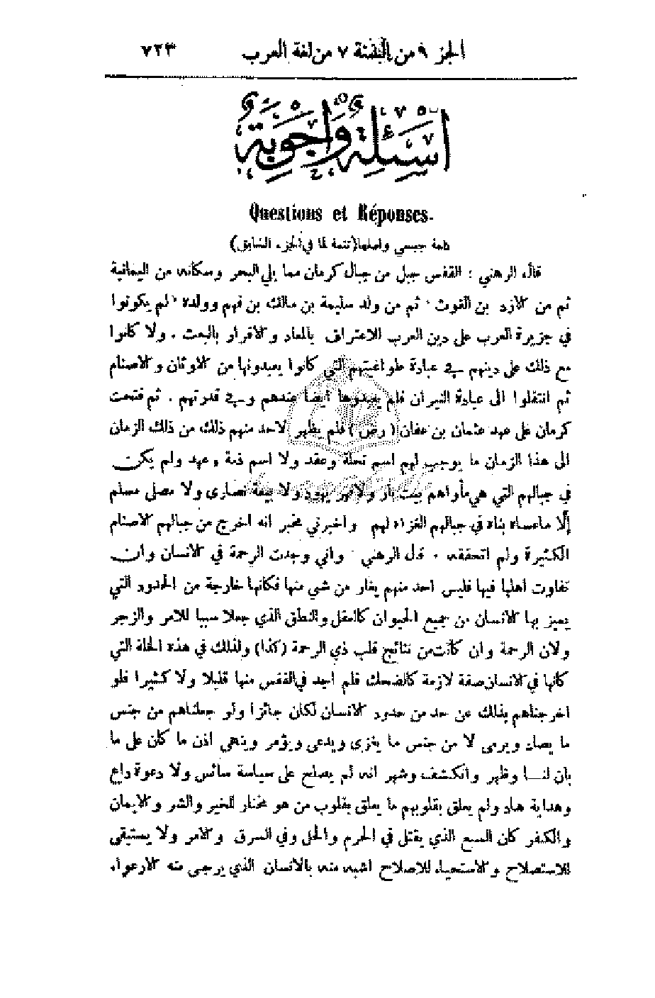 قال الرهني: القفس جبل من جبال كرمان مما يلي البحر وسكانه من اليمانية ثم من الأزد بن الغوث، ثم من ولد سليمة بن مالك بن فهم وولده، لم يكونوا في جزيرة العرب على دين العرب للاعتراف بالمعاد والإقرار بالبعث، ولا كانوا مع ذلك على دينهم في عبادة طواغيتهم التي كانوا يعبدونها من الأوثان والأصنام ثم انتقلوا إلى عبادة النيران فلم يعبدوها أيضا عندهم وفي قدرتهم. ثم فتحت كرمان على عهد عثمان بن عفان (رض) فلم يظهر لأحد منهم ذلك من ذلك الزمان إلى هذا الزمان ما يوجب لهم اسم نحلة وعقد ولا اسم ذمة وعهد ولم يكن في جبالهم التي هي مأواهم بيت نار ولا فهر يهود ولا بيعة نصارى ولا مصلى مسلم إلا ما عساه بناه في جبالهم الغزاة لهم وأخبرني مخبر أنه أخرج من جبالهم الأصنام الكثيرة ولم أتحققه. قال الرهني: وإني وجدت الرحمة في الإنسان وإن تفاوت أهلها فيها فليس أحد منهم يغار من شي منها فكأنها خارجة من الحدود التي يميز بها الإنسان من جميع الحيوان كالعقل والنطق الذي جعلا سببا للأمر والزجر ولأن الرحمة وإن كانت من نتائج قلب ذي الرحمة (كذا) ولذلك في هذه الخلة التي كأنها في الإنسان صفة لازمة كالضحك فلم أجد في القفس منها قليلا ولا كثيرا فلو أخرجناهم بذلك عن حد من حدود الإنسان لكان جائزا ولو جعلناهم من جنس ما يصاد ويرمى لا من جنس ما يغزى ويدعى ويؤمر وينهى إذن ما كان على ما بان لنا وظهر وانكشف وشهر أنه لم يصلح على سياسة سائس ولا دعوة داع وهداية هاد ولم يعلق بقلوبهم ما يعبق بقلوب من هو مختار للخير والشر والإيمان والكفر كان السبع الذي يقتل في الحرم والحل وفي السرق والأمر ولا يستبقى للاستصلاح والاستحياء للإصلاح أشبه منه بالإنسان الذي يرجى منه الأرعواء