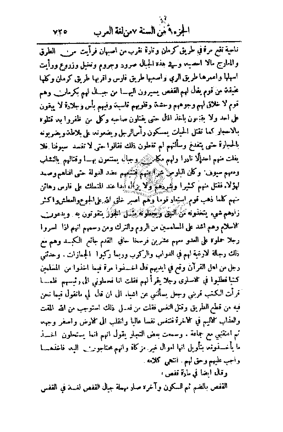 ناحية نقع مرة في طريق كرمان وتارة نقرب من أصبهان فرأيت من الطرق والمعارج مالا أحصيه وفي هذه الجبال صرود وجروم ونخيل وزروع ورأيت أسهلها وأعمرها طريق الري وأصعبها طريق فارس وأقربها طريق كرمان وكلها مخيفة من قوم يقال لهم القفص يسيرون إليها من جبال لهم بكرمان وهم قوم لا خلاق لهم وجوههم وحشة وقلوبهم قاسية وفيهم بأس وجلادة لا يبقون على أحد ولا يقنعون بأخذ المال حتى يقتلون صاحبه وكل من