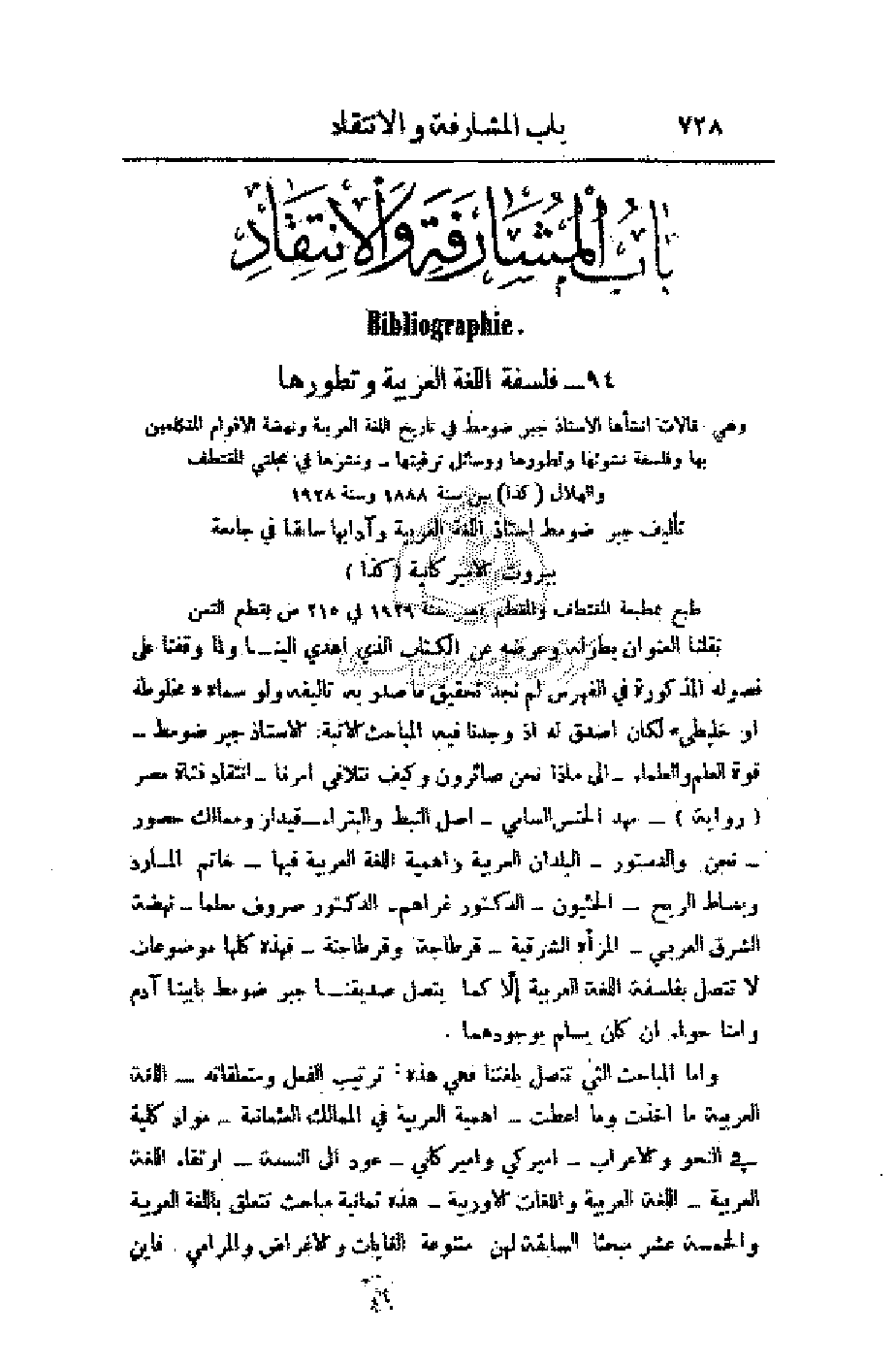 نقلنا العنوان بطوله وعرضه عن الكتاب الذي أهدي إلينا ولما وقفنا على فصوله المذكورة في الفهرس لم نجد تحقيق ما صدر به تأليفه ولو سماه (مخلوطة أو خليطى) لكان أصدق له إذ وجدنا فيه المباحث الآتية: الأستاذ جبر ضومط - قوة العلم والعلماء - إلى ماذا نحن صائرون وكيف نتلافى أمرنا - انتقاد فتاة مصر (رواية) - مهد الجنس السامي - أصل النبط والبتراء - قيدار وممالك حصور - نحن والدستور - البلدان العربية وأهمية اللغة العربية فيها - خاتم المارد وبساط الريح - الحثيون - الدكتور غراهم - الدكتور صروف معلما - نهضة الشرق العربي - المرأة الشرقية - قرطاجة وقرطاجنة - فهذه كلها موضوعات لا تتصل بفلسفة اللغة العربية إلا كما يتصل صديقنا جبر ضومط بأبينا آدم وأمنا حواء إن كان يسلم بوجودهما.