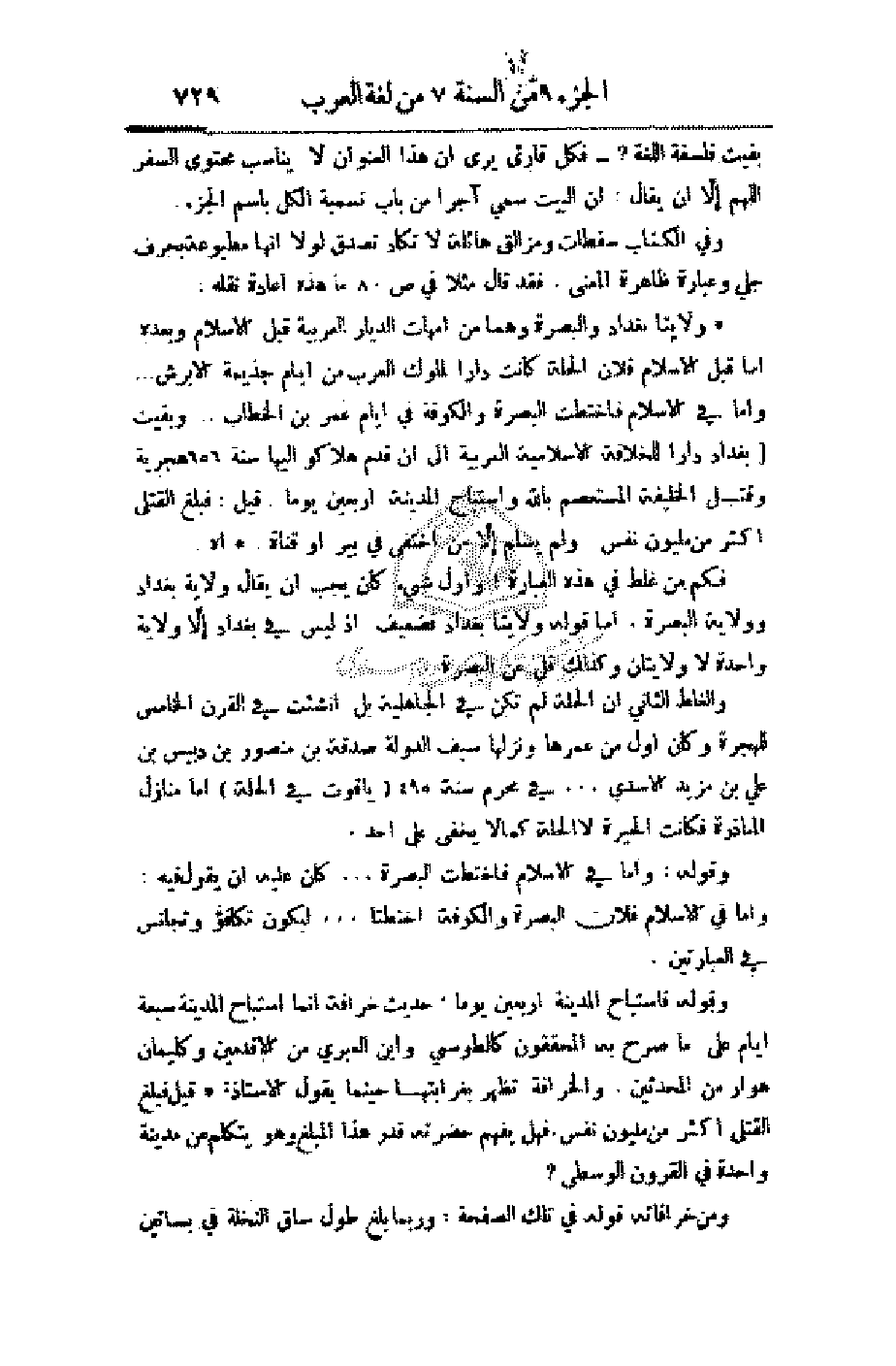 (ولايتا بغداد والبصرة وهما من أمهات الديار العربية قبل الإسلام وبعده أما قبل الإسلام فلأن الحلة كانت دارا لملوك العرب من أيام جذيمة الأبرش. . وأما في الإسلام فاختطت البصرة والكوفة في أيام عمر بن الخطاب. . وبقيت (بغداد دارا للخلافة العربية إلى أن قدم هلاكو إليها سنة 656 هجرية وقتل الخليفة المستعصم بالله واستباح المدينة أربعين يوما. قيل: فبلغ القتلى أكثر من مليون نفس. ولم يسلم إلا من اختفى في بئر أو في قناة.) اهـ.