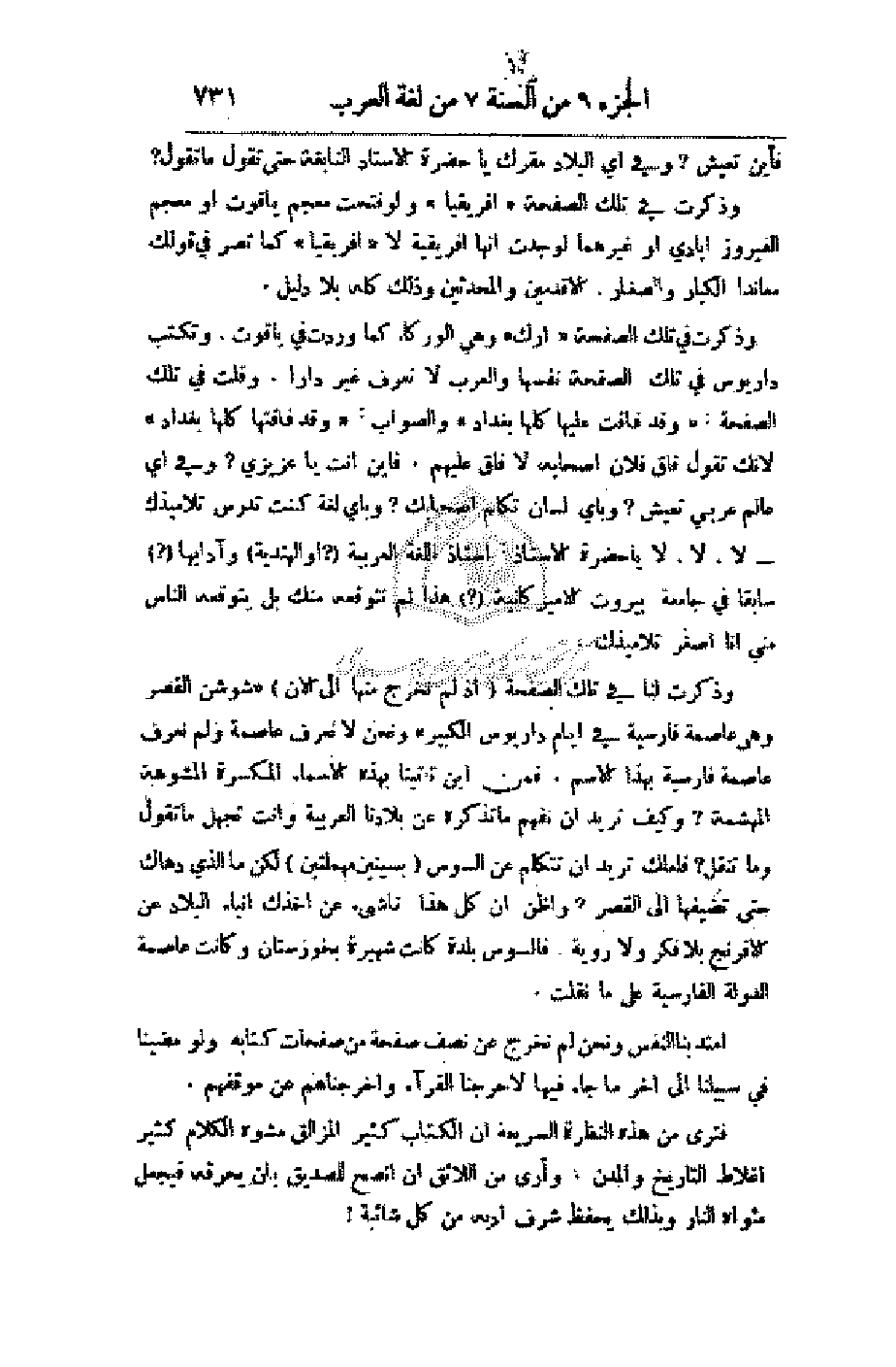 وذكرت لنا في تلك الصفحة (إذ لم نخرج منها إلى الآن) (شوشن القصر وهي عاصمة فارسية في أيام داريوس الكبير) ونحن لا نعرف عاصمة ولم نعرف عاصمة فارسية بهذا الاسم. فمن أين تأتينا بهذه الأسماء المكسرة المشوهة المهشمة؟ وكيف تريد أن نفهم ما تذكره عن بلادنا العربية وأنت تجهل ما تقول وما تنقل؟ فلعلك تريد أن تتكلم عن السوس (بسينين مهملتين) لكن ما الذي دهاك حتى تضيفها إلى القصر؟ وأظن أن كل هذا ناشئ عن أخذك أنباء البلاد عن الإفرنج بلا فكر ولا روية. فالسوس بلدة كانت شهيرة بخوزستان وكانت عاصمة الدولة الفارسية على ما نقلت.