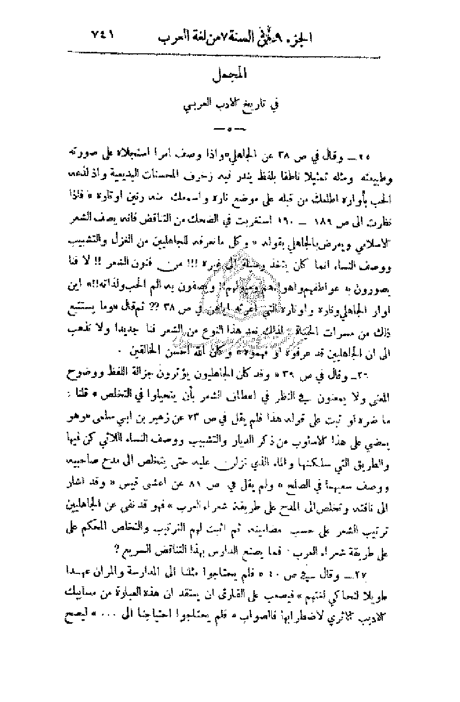 25 - وقال في ص 38 عن الجاهلي (وإذا وصف أمرا استجلاه على صورته وطبيعته ومثله تمثيلا ناطقا بلفظ يندر فيه زخرف المحسنات البديعية وإذ لذعه الحب بأوراره أطلعك من قبله على موضع ناره وأسمعك منه رنين أوتاره) فإذا نظرت إلى ص 189 - 190 استغربت في الضحك من التناقض فإنه يصف الشعر الإسلامي ويعرض بالجاهلي بقوله (وكل ما نعرفه للجاهليين من الغزل والتشبيب ووصف النساء إنما كان يتخذ وسيلة إلى غيره!!! من فنون الشعر!! لا فنا يصورون به عواطفهم وأهواءهم وميولهم!! ويصفون به ألم الحب ولذاته!!) أين أوار الجاهلي وناره وأوتاره التي أعرته إياهن في ص 38؟؟ ثم قال (وما يستتبع ذلك من مسرات الحياة، لذلك نعد هذا النوع من الشعر فنا جديدا ولا نذهب إلى أن الجاهليين قد عرفوه أو فهموه) وكان الله أحسن الخالقين.