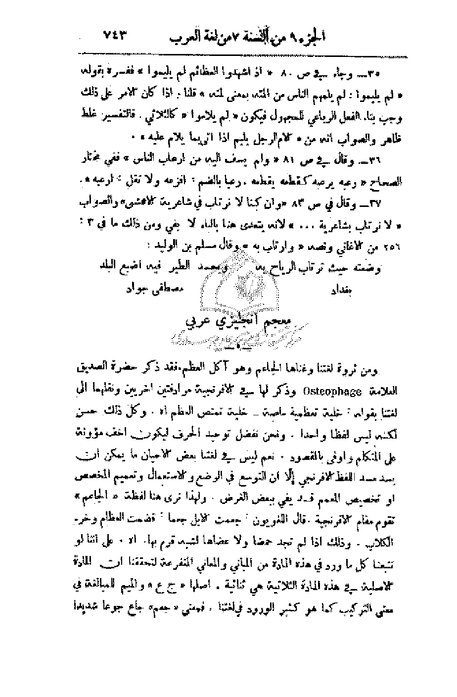 ومن ثروة لغتنا وغناها الجاعم وهو آكل العظام. فقد ذكر حضرة الصديق العلامة وذكر لها في الإفرنجية مرادفتين أخريين ونقلهما إلى لغتنا بقوله: خلية تعظمية ماصة - خلية تمتص العظم اهـ. وكل ذلك حسن لكنه ليس لفظا واحدا. ونحن نفضل توحيد الحرف ليكون أخف مؤونة على المتكلم وأوفى بالمقصود. نعم ليس في لغتنا بعض الأحيان ما يمكن أن يسد مسد اللفظ الإفرنجي إلا أن التوسع في الوضع والاستعمال وتعميم المخصص أو تخصيص المعمم قد يفي ببعض الغرض. ولهذا نرى هنا لفظة (الجاعم) تقوم مقام