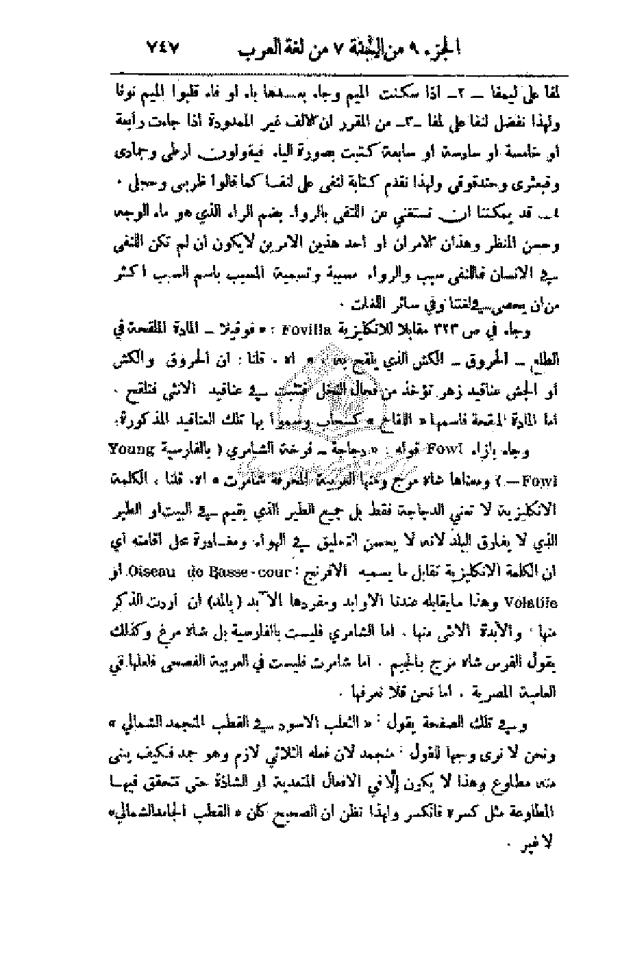 وجاء بازاء قوله: (دجاجة - فرخة الشامري (بالفارسية - ومعناها شاه مرج ومنها العربية المحرفة شامرت) اهـ. قلنا، الكلمة الإنكليزية لا تعني الدجاجة فقط بل جميع الطير الذي يقيم في البيت أو الطير الذي لا يفارق البلد لأنه لا يحسن التحليق في الهواء ومغادرة محل إقامته أي أن الكلمة الإنكليزية تقابل ما يسميه الإفرنج: - أو وهذا ما يقابله عندنا الأوابد ومفردها الآبد (بالمد) إن أردت الذكر منها، والآبدة الأنثى منها. أما الشامري فليست بالفارسية بل شاه مرغ وكذلك يقول الفرس شاه مرج بالجيم. أما شامرت فليست في العربية الفصحى فلعلها في العامية المصرية. أما نحن فلا نعرفها.