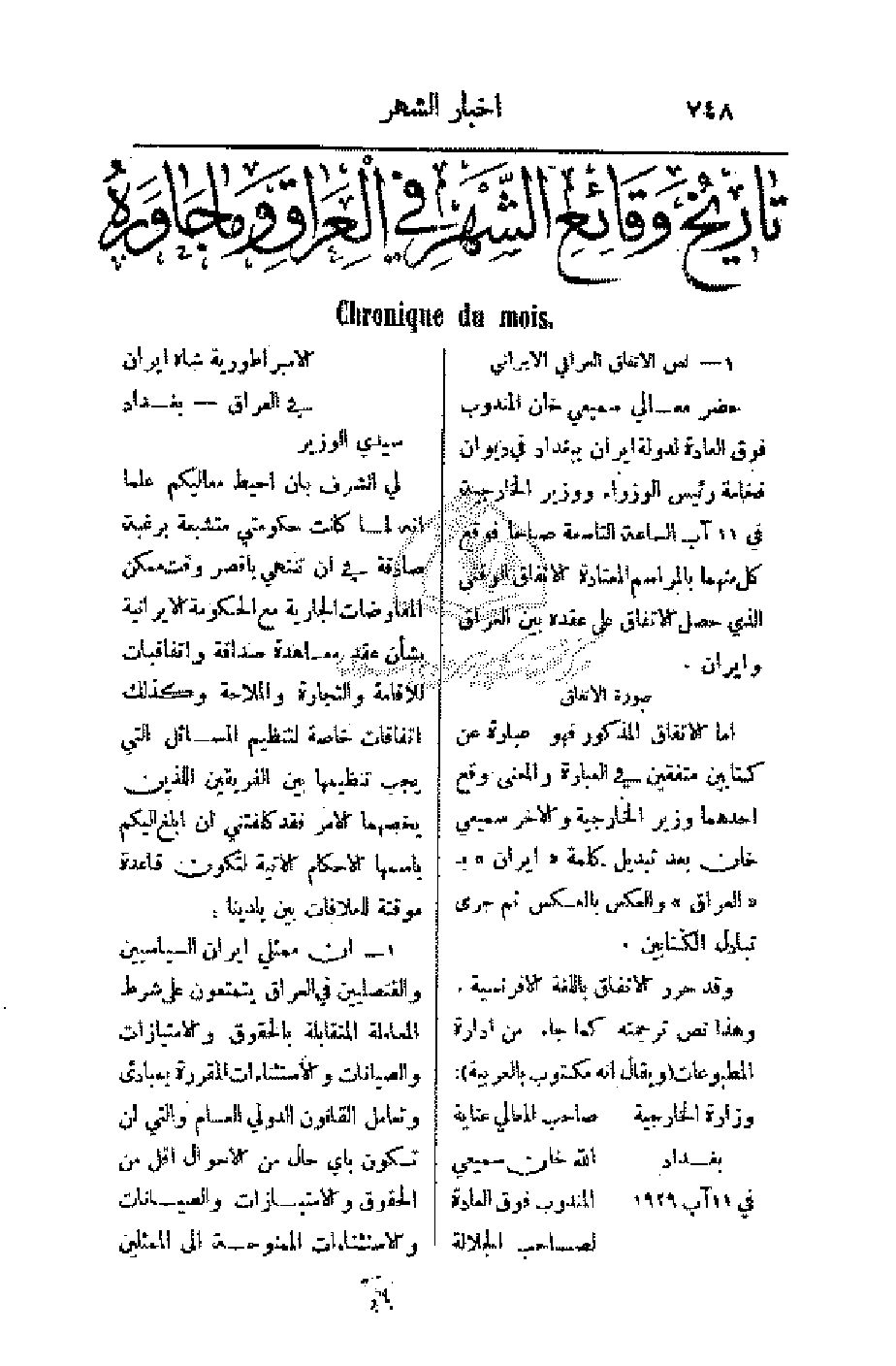 لي الشرف بأن أحيط معاليكم علما أنه لما كانت حكومتي متشبعة برغبة صادقة في أن تنتهي بأقصر وقت ممكن المفاوضات الجارية مع الحكومة الإيرانية بشأن عقد معاهدة صداقة واتفاقيات للإقامة والتجارة والملاحة وكذلك اتفاقات خاصة لتنظيم المسائل التي يجب تنظيمها بين الفريقين اللذين يخصهما الأمر فقد كلفتني أن أبلغ إليكم باسمها الأحكام الآتية لتكون قاعدة موقتة للعلاقات بين بلدينا: