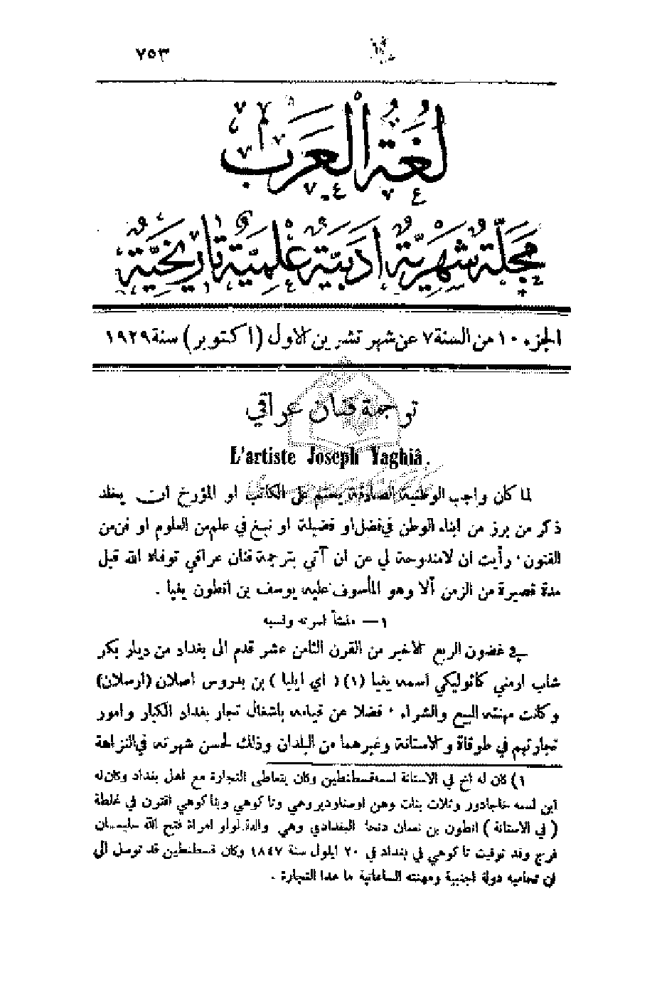 لما كان واجب الوطنية الصادقة يحتم على الكاتب أو المؤرخ أن يخلد ذكر من برز من أبناء الوطن في فضل أو فضيلة أو نبغ في علم من العلوم أو فن من الفنون، رأيت أن لا مندوحة لي عن أن آتي بترجمة فنان عراقي توفاه الله قبل مدة قصيرة من الزمن ألا وهو المأسوف عليه يوسف بن أنطون يغيا.