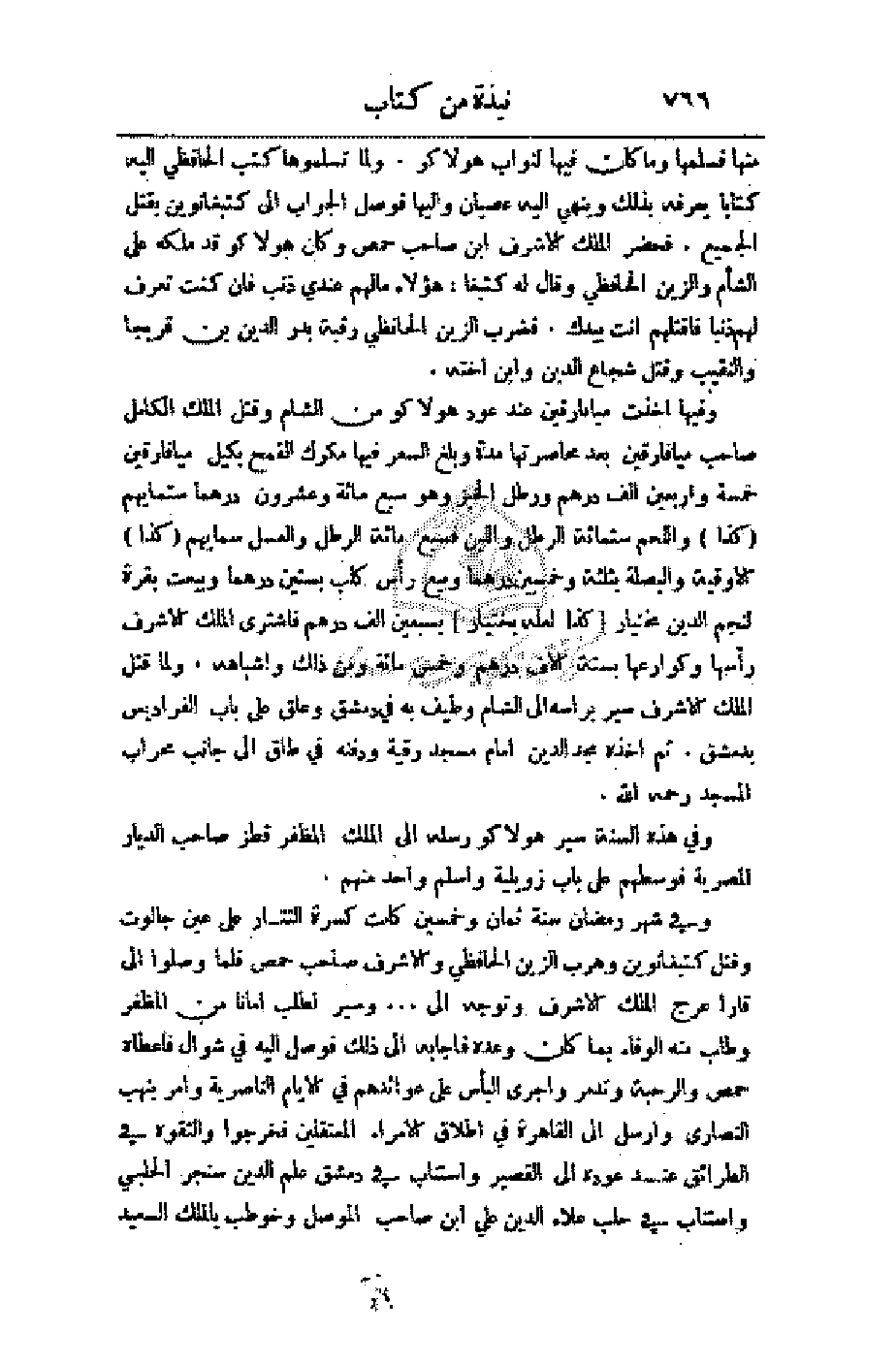 منها فسلمها وما كان فيها لنواب هولاكو. ولما تسلموها كتب الحافظي إليه كتاباً يعرفه بذلك وينهى إليه عصيان وإليها فوصل الجواب إلى كتغانوين بقتل الجميع. فحضر الملك الأشرف ابن صاحب حمص ولك هولاكو قد ملكه على الشأم والزين الحافظي وقال له كتبغان هؤلاء ما لهم عندي ذنب فإن كنت تعرف لهم ذنباً فاقتلهم أنت بديك، فضرب الزين الحافظي رقبة بدر الدين بن قريجا والنقيب وقتل شجاع الدين وابن أخته.