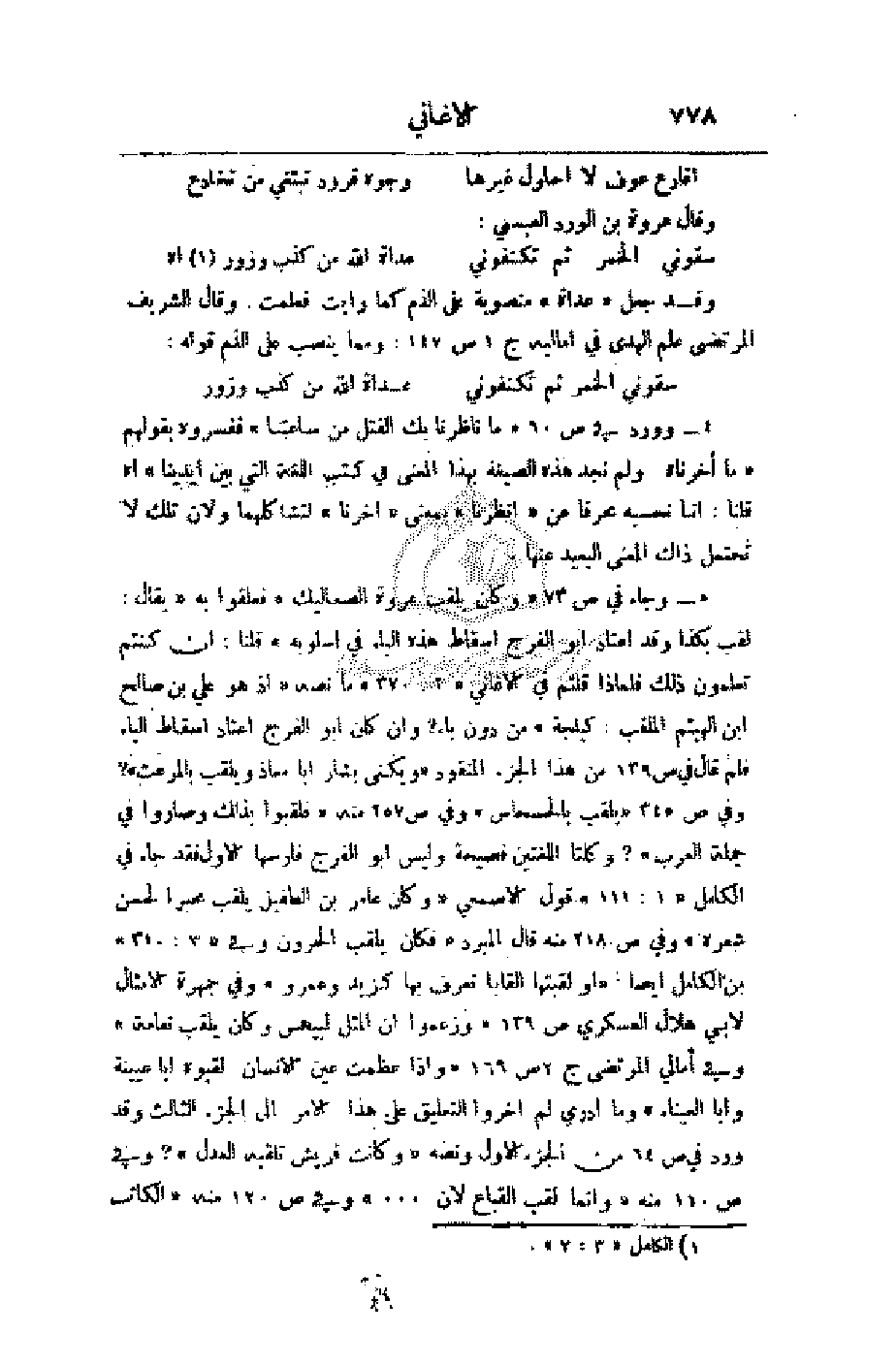 5 - وجاء في ص 73 (وكان يلقب عروة الصعاليك) فعلقوا به (يقال: لقب بكذا وقد اعتاد أبو الفرج إسقاط هذه الباء في أسلوبه) قلنا: إن كنتم تعلمون ذلك فلماذا قلتم في الأغاني (370: 2) ما نصه (إذ هو علي بن صالح ابن الهيثم الملقب: كيلجة) من دون باء؟ وإن كان أبو الفرج اعتاد إسقاط الباء فلم قال في ص 139 من هذا الجزء المنقود (ويكنى بشار أبا معاذ ويلقب بالمرعث)؟ وفي ص 345 (يلقب بالحسحاس) وفي ص 257 منه (فلقبوا بذلك وصاروا في جملة العرب)؟ وكلتا اللغتين فصيحة وليس أبو الفرج فارسها الأول فقد جاء في الكامل (111: 1) قول الأصمعي (وكان عامر بن الطفيل يلقب محبرا لحسن شعره) وفي ص 218 منه قال المبرد (فكان يلقب الحرون وفي (310: 3) من الكامل أيضا: (لو لقبتها ألقابا تعرف بها كزيد وعمرو) وفي جمهرة الأمثال لأبي هلال العسكري ص 139 (وزعموا أن المثل لبيهس وكان يلقب نعامة) وفي أمالي المرتضى ج 2 ص 169 (وإذا عظمت عين الإنسان لقبوه أبا عيينة وأبا العيناء) وما أدري لم أخروا التعليق على هذا الأمر إلى الجزء الثالث وقد ورد في ص64 من الجزء الأول ونصه (وكانت قريش تلقبه العدل)؟ وفي ص 110 منه (وإنما لقب القباع لأن. . .) وفي ص120 منه (الكاتب