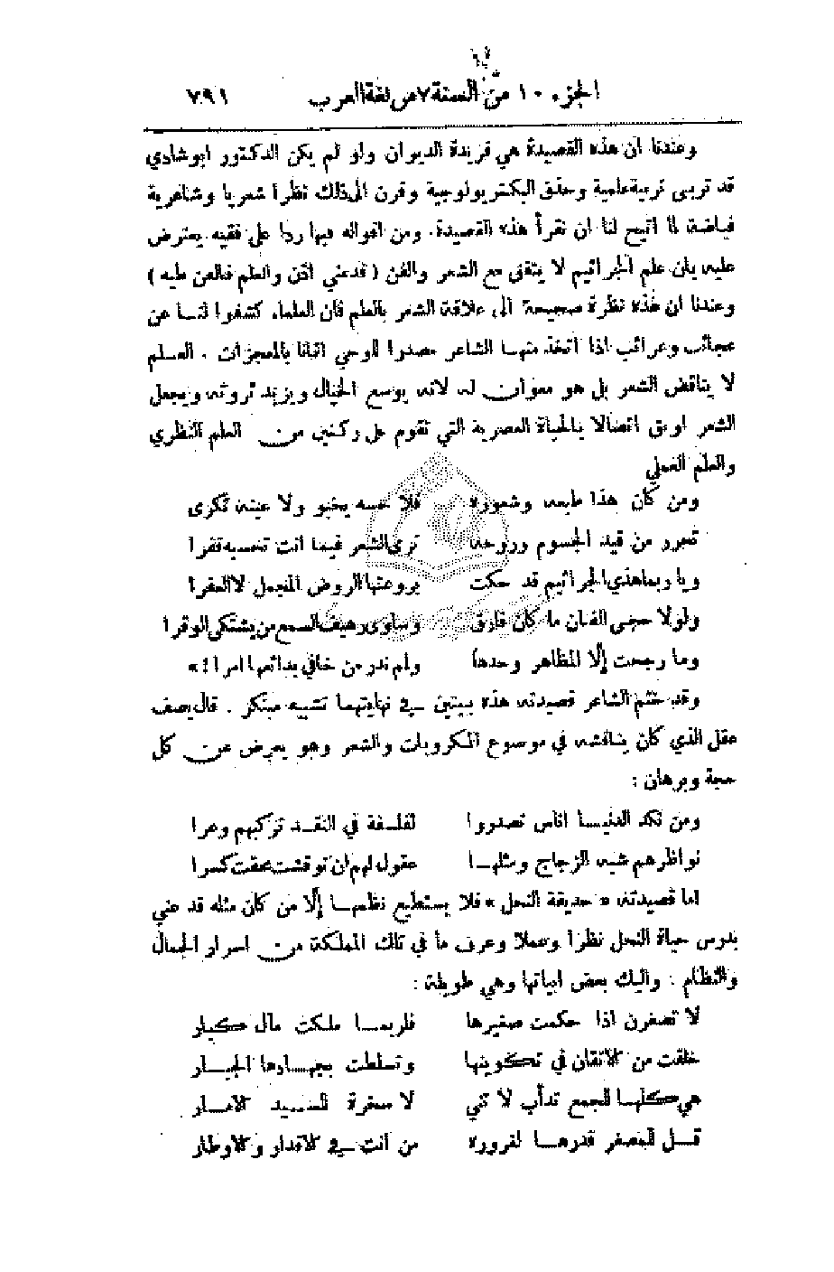 وعندنا أن هذه القصيدة هي فريدة الديوان ولو لم يكن الدكتور أبو شادي قد تربى تربية علمية وحذق البكتريولوجية وقرن إلى ذلك نظرا شعريا وشاعرية فياضة لما أتيح لنا أن نقرأ هذه القصيدة. ومن أقواله فيها ردا على فقيه يعترض عليه بأن علم الجراثيم لا يتفق مع الشعر والفن (فدعني إذن والعلم فالفن طيه) وعندنا أن هذه نظرة صحيحة إلى علاقة الشعر بالعلم فإن العلماء كشفوا لنا عن عجائب وغرائب إذا اتخذ منها الشاعر مصدراً