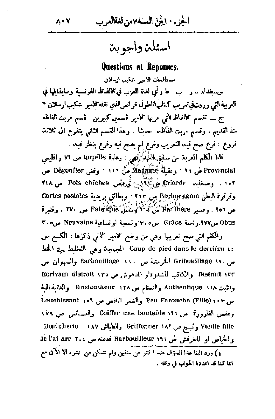 س - بغداد - ر ب: ما رأي لغة العرب في الألفاظ الفرنسية وما يقابلها في العربية التي وردت في تعريب كتاب أناطول فراس الذي نقله الأمير شكيب أرسلان؟