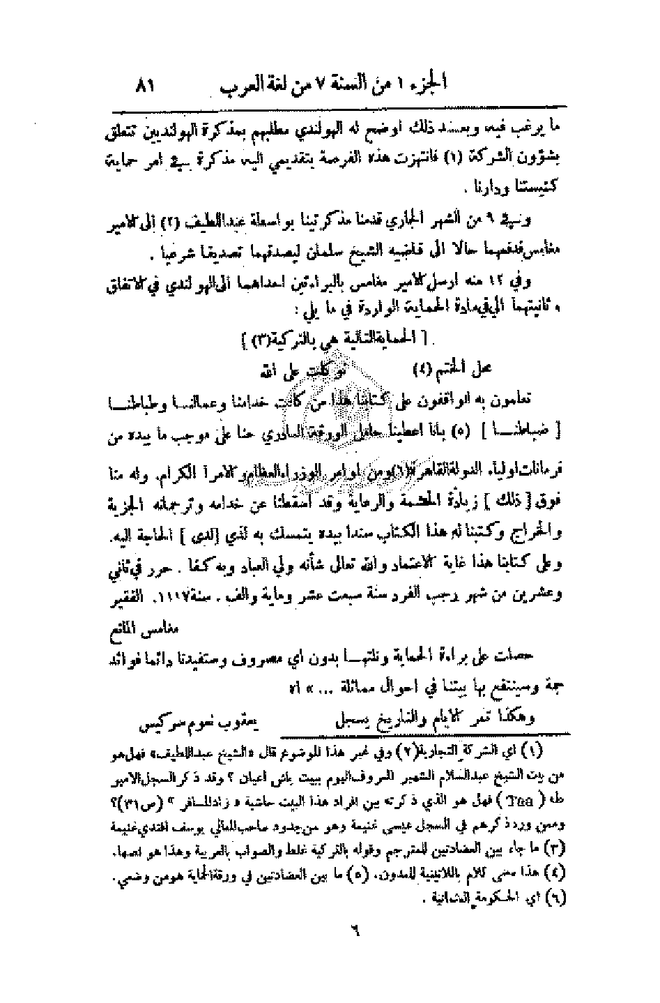 تعلمون به الواقفون على كتابنا هذا من كافت خدامنا وعمالنا وطباطنا (ضباطنا) بانا أعطينا حامل الورقة النادري حنا على موجب ما بيده من فرمانات أولياء الدولة القاهرة ومن أوامر الوزير العظام والأمراء الكرام. وله منا فوق (ذلك) زيادة الحشمة والرعاية وقد أسقطنا عن خدامه وترجمانه الجزية والخراج وكتبنا له هذا الكتاب سنداً بيده يتمسك به الذي (لدى) الحاجة إليه. وعلى كتابنا هذا غاية الاعتماد والله تعالى شأنه ولي العباد وبه كفا. حرر في ثاني وعشرين من شهر رجب الفرد سنة سبعت عشر وماية وألف. سنة 1117.