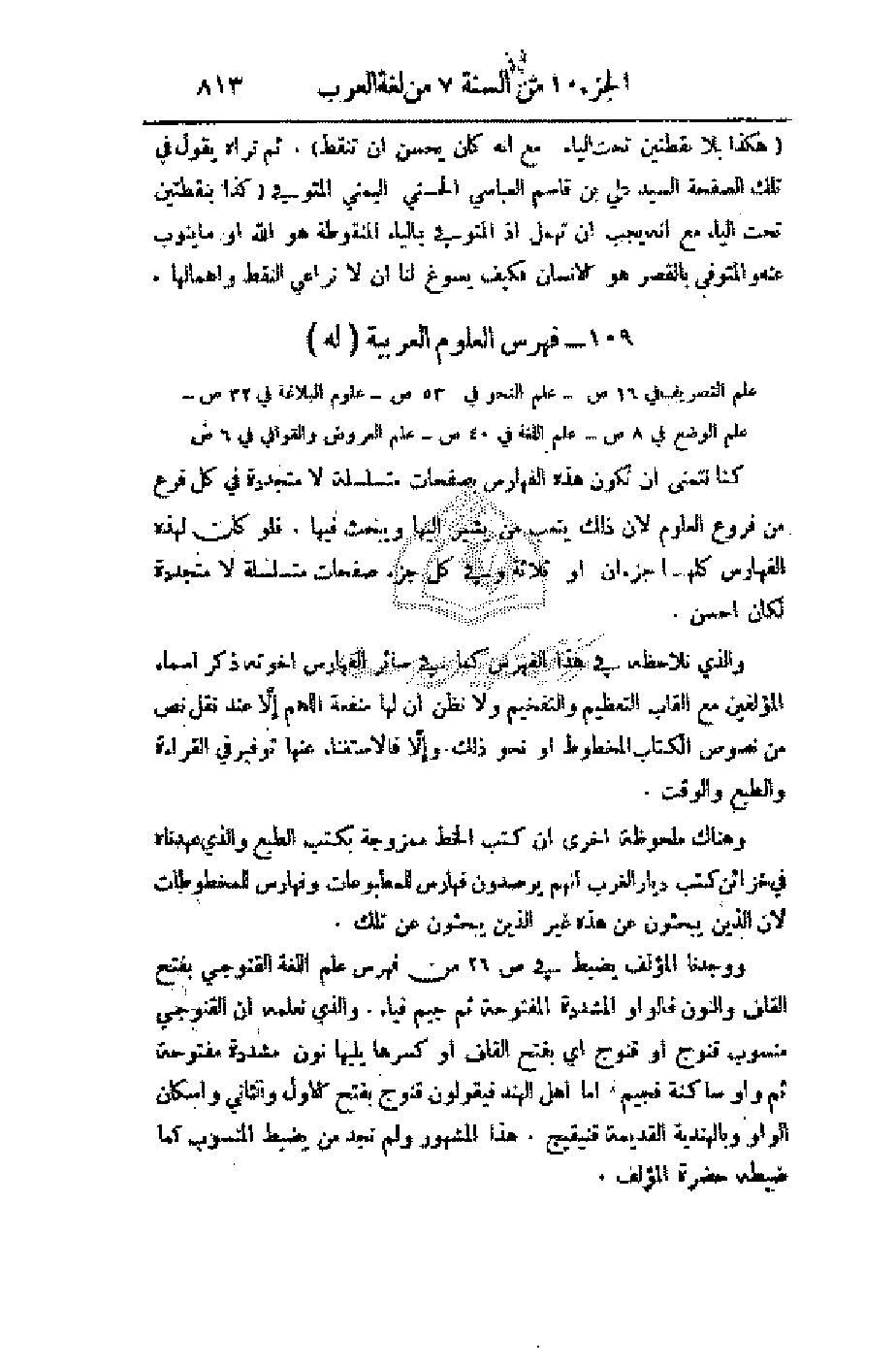 ووجدنا المؤلف بضبط في ص 26 من فهرس علم اللغة القنوجي بفتح القاف والنون فالواو المشددة المفتوحة ثم جيم فياء. والذي نعلمه أن القنوجي منسوب قنوج أو قنوج أي بفتح القاف أو كسرها يليها نون مشددة مفتوحة ثم واو ساكنة فجيم. أما أهل الهند فيقولون قنوج بفتح الأول والثاني وإسكان الواو وبالهندية القديمة قنيقيج. هذا المشهور ولم نجد من يضبط المنسوب كما ضبطه حضرة المؤلف.