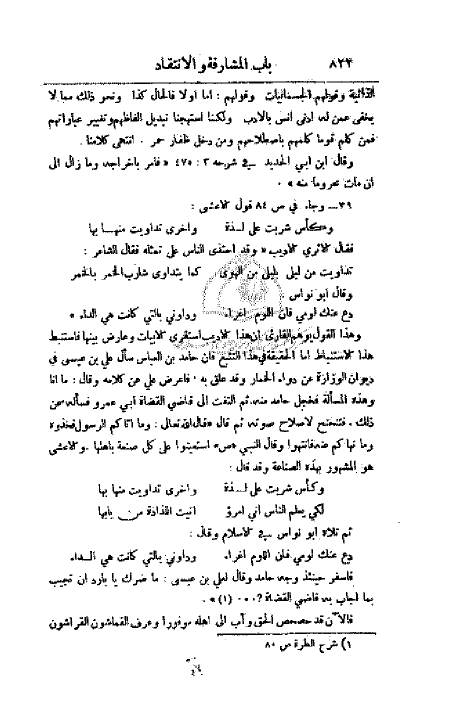 وهذا القول يوهم القارئ أن هذا الأديب استقرى الأبيات وعارض بينها فاستنبط هذا الاستنباط أما الحقيقة في هذا التتبع فأن حامد بن العباس سأل علي بن عيسى في ديوان الوزارة عن دواء الخمار وقد علق به، فأعرض علي عن كلامه وقال: ما أنا وهذه المسألة فخجل حامد منه. ثم التفت إلى قاضي القضاة أبي عمرو فسأله عن ذلك. فتنحنح لإصلاح صوته ثم قال (قال الله تعالى: وما أتاكم الرسول فخذوه وما نهاكم عنه فانتهوا وقال النبي (ص) استعينوا على كل صنعة بأهلها والأعشى هو المشهور بهذه الصناعة وقد قال: