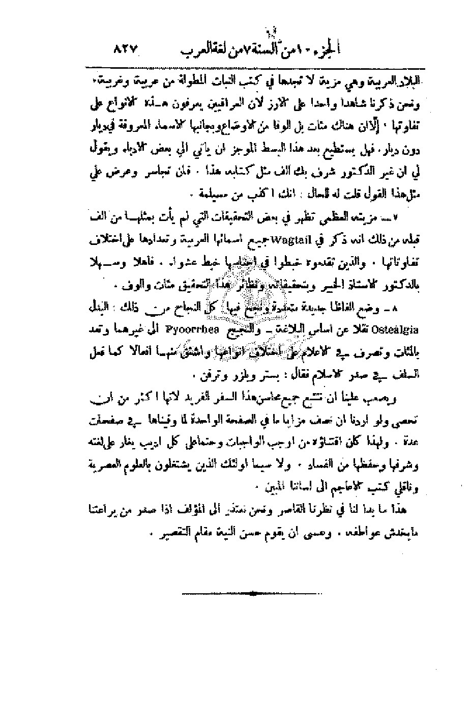 7 - مزيته العظمى تظهر في بعض التحقيقات التي لم يأت بمثلها من ألف قبله من ذلك أنه ذكر في جميع أسمائها العربية وتعدادها على اختلاف تفاوتاتها. والذين تقدموه خبطوا في أجناسها خبط عشواء. فأهلاً وسهلاً بالدكتور الأستاذ الخبير وبتحقيقاته ونظائر هذا التحقيق مئات وألوف.