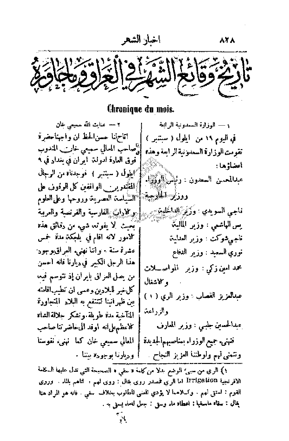 أتاح لنا حسن الحظ أن واجهنا حضرة صاحب المعالي سميعي خان المندوب فوق العادة لدولة إيران في بغداد في 9 أيلول (سبتنبر) فوجدناه من الرجال المقتدرين الواقفين كل الوقوف على السياسة العصرية وروحها وعلى العلوم والآداب الفارسية والفرنسية والعربية بحيث لا يفوته شيء من دقائق هذه الأمور لأنه أقام في بلجكة مدة خمس عشرة سنة. وإننا نهنئ العراق بوجود هذا الرجل الكبير في ديارنا فإنه أحسن من يصل العراق بإيران إذ نتوسم فيه كل خير للبلادين وعسى أن تطيب إقامته بين ظهرانينا لتنتفع به البلاد المتجاورة المتآخية مدة طويلة. ونشكر جلالة الشاه الأعظم على أنه أوفد إلى حاضرتنا صاحب المعالي سميعي خان كما نهنئ نفوسنا وديارنا بوجوده بيننا.