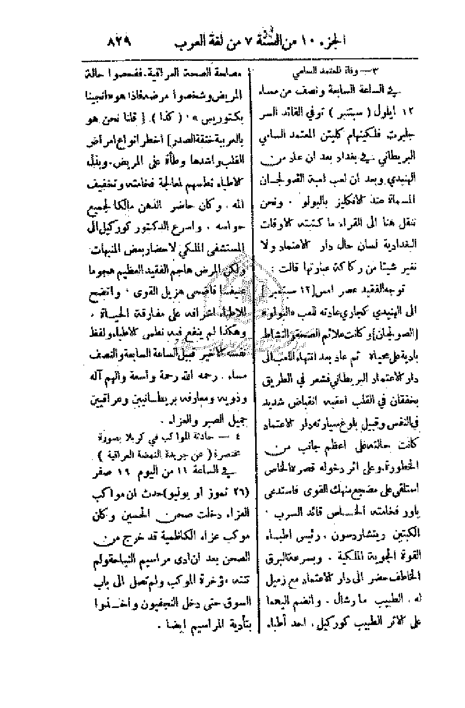 توجه الفقيد عصر أمس (12 سبتمبر) إلى الهنيدي كجاري عادته للعب (البولو) (الصولجان) وكانت علائم الصحة والنشاط بادية على محياه. ثم عاد بعد انتهاء اللعب إلى دار الاعتماد البريطاني فشعر في الطريق بخفقان في القلب أعقبه انقباض شديد في النفس وقبيل بلوغ سيارته دار الاعتماد كانت حالته على أعظم جانب من الخطورة وعلى أثر دخوله قصره الخاص استلقى على مضجع منهك القوى فاستدعى ياور فخامته الخاص قائد السرب، الكبتين ريتشاردسون، رئيس أطباء القوة الجوية الملكية. وبسرعة البرق الخاطف حضر إلى دار الاعتماد مع زميل له، الطبيب مارشال. وانضم إليهما على الأثر الطيب كوركيل، أحد أطباء مصلحة الصحة العراقية. ففحصوا حالة المريض وشخصوا مرضه فإذا هو (أنجينا بكتوريس)، (كذا) (قلنا نحن هو بالعربية خنقة الصدر) أخطر أنواع أمرض القلب وأشدها وطأة على المريض. وبذل الأطباء نطسهم لمعالجة فخامته وتخفيف ألمه، وكان حاضر الذهن مالكا لجميع حواسه. وأسرع الدكتور كوركيل إلى المستشفى الملكي لإحضار بعض المنبهات ولكن المرض هاجم الفقيد العظيم هجوما عنيفا فأضحى هزيل القوى، واتضح للأطباء إشرافه على مفارقة الحياة. وهكذا لم ينفع فيه نطس الأطباء ولفظ نفسه الأخير قبيل السابعة والنصف مساء. رحمه الله رحمة واسعة وألهم آله وذويه ومعارفه بريطانيين وعراقيين جميل الصبر والعزاء.