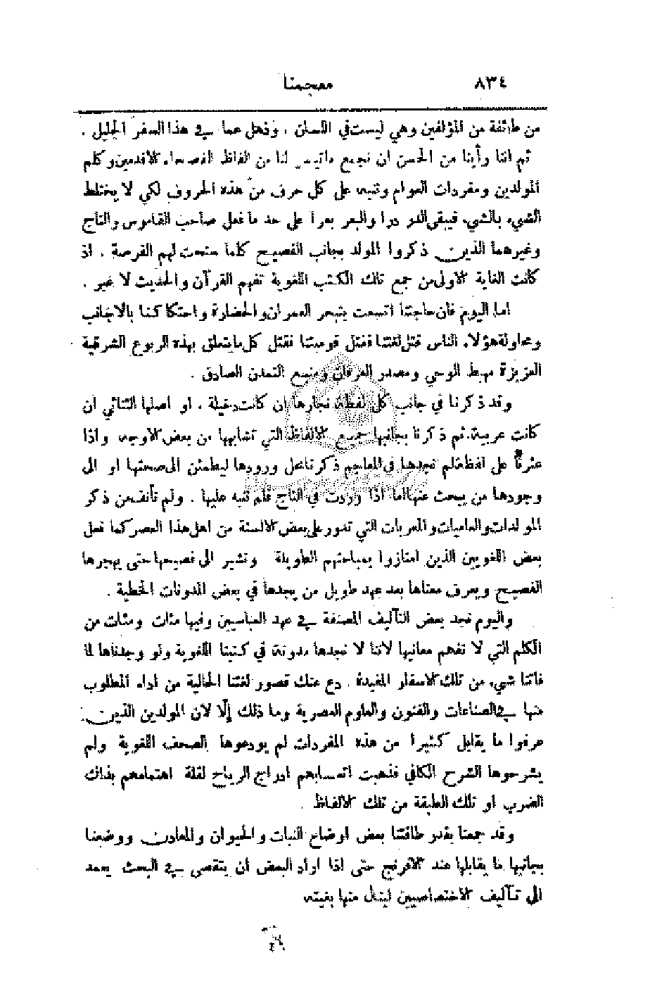 واليوم نجد بعض التآليف المصنفة في عهد العباسيين وفيها مئات ومئات من الكلم التي لا نفهم معانيها لأننا لا نجدها مدونة في كتبنا اللغوية ولو وجدناها لما فاتنا شيء من تلك الأسفار المفيدة. دع عنك قصور لغتنا الحالية من أداء المطلوب منها في الصناعات والفنون والعلوم العصرية وما ذلك إلا لأن المولدين الذين عرفوا ما يقابل كثيرا من هذه المفردات لم يودعوها الصحف اللغوية ولم يشرحوها الشرح الكافي فذهبت أتعابهم أدراج الرياح لقلة اهتمامهم بذاك الضرب أو تلك الطبقة من تلك الألفاظ.