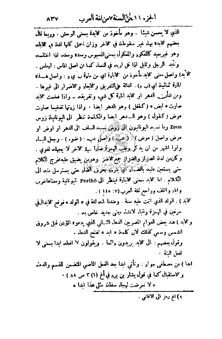 الأبد) وأصل معنى الأبد مأخوذة من الإبادة من مادة ب ي د: وأصل هذه المادة ثنائية أي (ب د) الدالة على التفريق والإبعاد والإضرار إلى غيرها. ومن شأن الدهر أو الأبد إبادة كل شيء. وتفريقه - وإذا فخمت الأبد صارت (ابض) (كقفل) وهو الدهر أيضا. وإذا زدتها تفخيما صارت عوض (كقول) وهو الدهر أيضا والكلمة تنظر إلى اليونانية زوس وما نسبة اليونانيون إلى زوس نسبة السلف إلى الدهر أو أوض أو عوض وأصل (عوض): (عبء) وأصل عبء: (ضوء) وجعل الباء واوا أشهر من أن يذكر وقلب الهمزة ضادا في الآخر لا يجهله لغوي. وكان من لغة الضزاز جمع الأضز: وهو من يضيق عليه مخرج الكلام حتى يستعين عليه بالضاد أي يتردد بحرف الضاد حتى يسترسل منه إلى الكلام. أما الأبد بمعنى الإبادة فينظر إلى اليونانية ومعناها خرب وأباد وأتلف وراجع لغة العرب (7: 145).