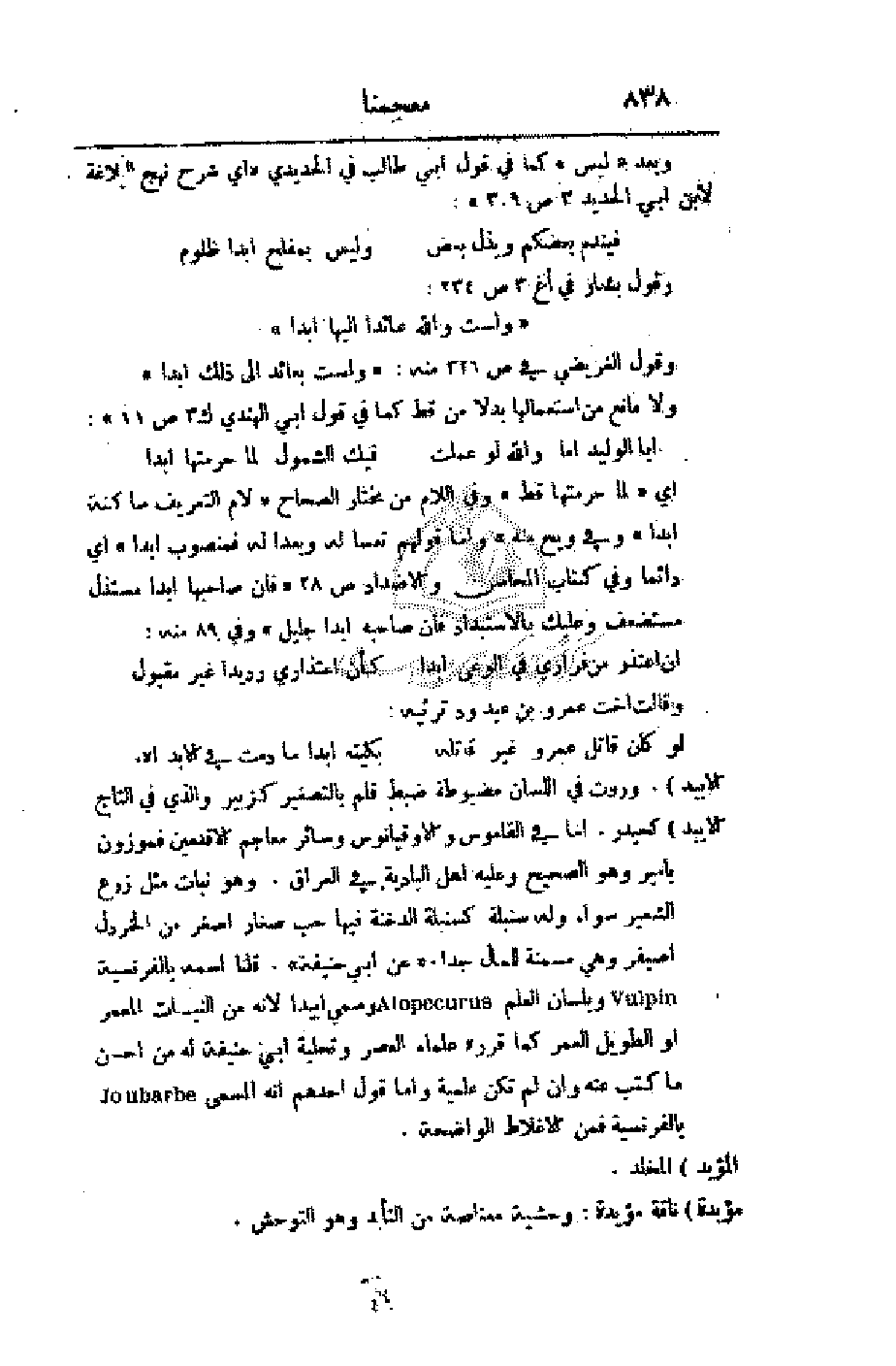 كسنبلة الدخنة فيها حب صغار أصغر من الخردل أصيفر وهي مسمنة للمال جدا. (عن أبي حنيفة). قلنا اسمه بالفرنسية وبلسان العالم وسمي أبيدا لأنه من النبات المعمر أو الطويل العمر كما قرره علماء العصر وتحلية أبي حنيفة له من أحسن ما كتب عنه وإن لم تكن علمية وأما قول أحدهم أنه المسمى بالفرنسية فمن الأغلاط الواضحة.