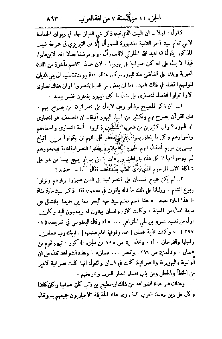 2 - إن ذكرى المسيح والحواريين لا يدل على نصرانية من يصرح بهم. فإن القرآن يصرح بهم وبكثير من أنبياء اليهود أفيقال أن المصحف هو للنصارى أو لليهود؟ وأن كثيرين من شعراء المسلمين ذكروا أئمة النصارى وأسماءهم وأسرارهم وكل ما يتعلق بهم، ولم يخطر على بالهم أن يكونوا من أتباع عيسى بن مريم أفيقال أنهم أظهروا الإسلام وأبطنوا النصرانية لغاية في صدورهم لم يبوحوا بها؟ كل هذه خرافات وترهات يتسلى بها أو يلهج بها من هو على شاكلة الأب المرحوم الذي رأى العنب بعيدا عنه قال: يا ما أحمضه!