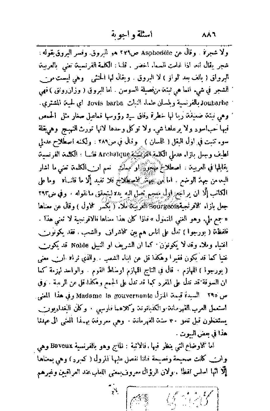 ولا شجرة. وقال عن ص 279 هو البروق وفسر البروق بقوله: شجر يقال أنه إذا غامت السماء اخضر. قلنا: الكلمة الفرنسية تعني بالعربية البرواق (بألف بعد الواو) لا البروق. ويقال لها الخنثى، وهي ليست من الشجر في شيء إنما هي نبتة من فصيلة السوسن. أما البروق (وزان رونق) فهي بالفرنسية وبلسان علماء النبات أي لحية المشتري. وهي نبتة ضعيفة ريا لها خطرة دقاق في رؤوسها قماعيل صغار مثل الحمص فيها حب أسود ولا يرعاها شيء ولا توكل وحدها لأنها تورث التهبج وهي بقلة سوء تنبت في أول البقل (اللسان) وقال في ص 289: ولكنه اصطلاح عدملي لطيف وجعل بازاء عدملي الكلمة الفرنسية قلنا: الكلمة الفرنسية يقابلها في العربية: اصطلاح مهجور أو ممات. نعم أن الكلمة تعني ما أشار إليه من جهة الوضع.
