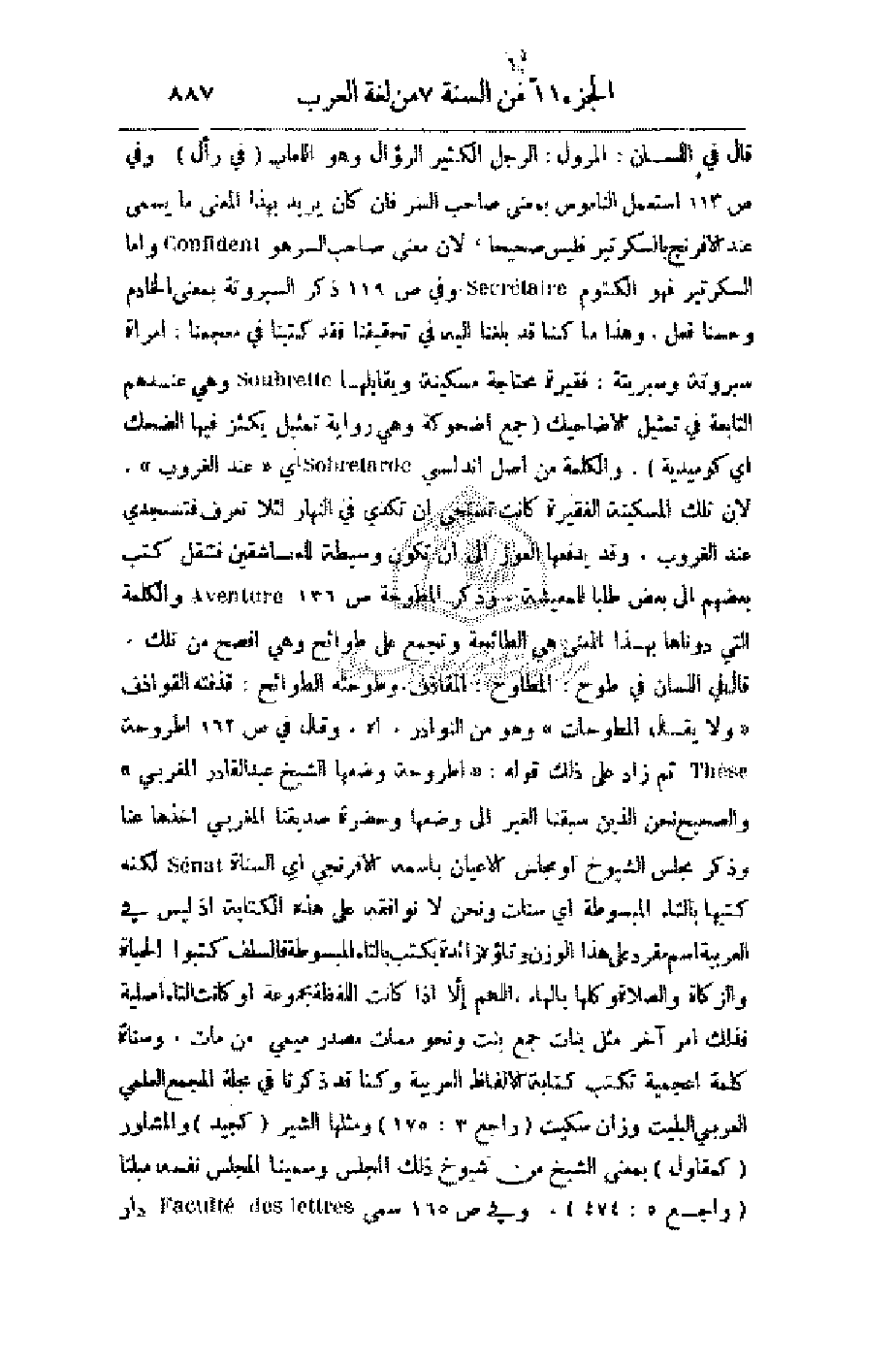 قال في اللسان: المرول: الرجل الكثير الرؤال وهو اللعاب (في رأل) وفي ص 113 استعمل الناموس بمعنى صاحب السر فإن كان يريد بهذا المعنى ما يسمى عند الإفرنج بالسكرتير فليس صحيحا، لأن معنى صاحب السر هو وأما السكرتير فهو الكتوم وفي ص 119 ذكر السبروتة بمعنى الخادم وحسنا فعل، وهذا ما كنا قد بلغنا إليه في تحقيقنا فقد كتبنا في معجمنا: امرأة سبروتة وسبريتة: فقيرة محتاجة مسكينة ويقابلها وهي عندهم التابعة في تمثيل الأضاحيك (جمع أضحوكة وهي رواية تمثيل يكثر فيها الضحك أي كوميدية). والكلمة من أصل أندلسي أي (عند الغروب)، لأن تلك المسكينة الفقيرة كانت تستحي أن تكدي في النهار لئلا تعرف فتستجدي عند الغروب. وقد يدفعها العوز إلى أن تكون وسيطة للعاشقين فتنقل كتب بعضهم إلى بعض طلبا للمعيشة. وذكر المطوحة ص 136 والكلمة التي دوناها بهذا المعنى هي الطائحة وتجمع على طوائح وهي أفصح من تلك. قال في اللسان في طوح: المطاوح: المقاذف. وطوحته الطوائح: قذفته القواذف (ولا يقال المطوحات) وهو من النوادر. اهـ. وقال في ص 162 أطروحة ثم زاد على ذلك قوله: (أطروحة وضعها الشيخ عبد القادر