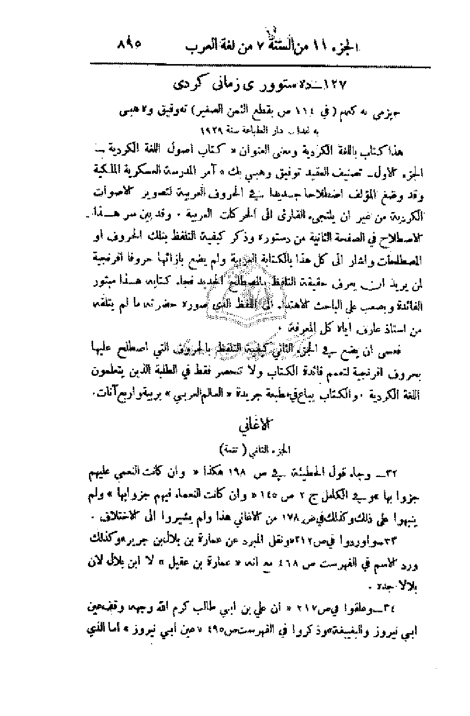 فعسى أن يضع في الجزء الثاني كيفية التلفظ بالحروف التي اصطلح عليها بحروف إفرنجية لتعمم فائدة الكتاب ولا تنحصر فقط في الطلبة الذين يتعلمون اللغة الكردية. والكتاب يباع في مطبعة جريدة (العالم العربي) بربية وأربع آنات.