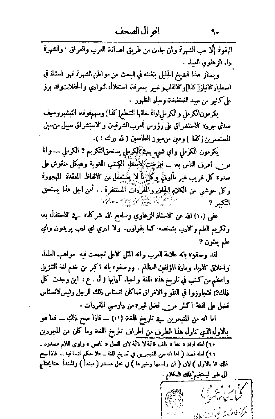 يكرمون الكرملي والكرملي أداة خلقها التنطع (كذا) وسهم فوقه التبشير وسيف صدئ جرده الاستشراق على رؤوس العرب الشرقيين والاستشراق سبيل من سبل المستعمرين (كذا) وعين من عيون الطامعين (لله درك!).