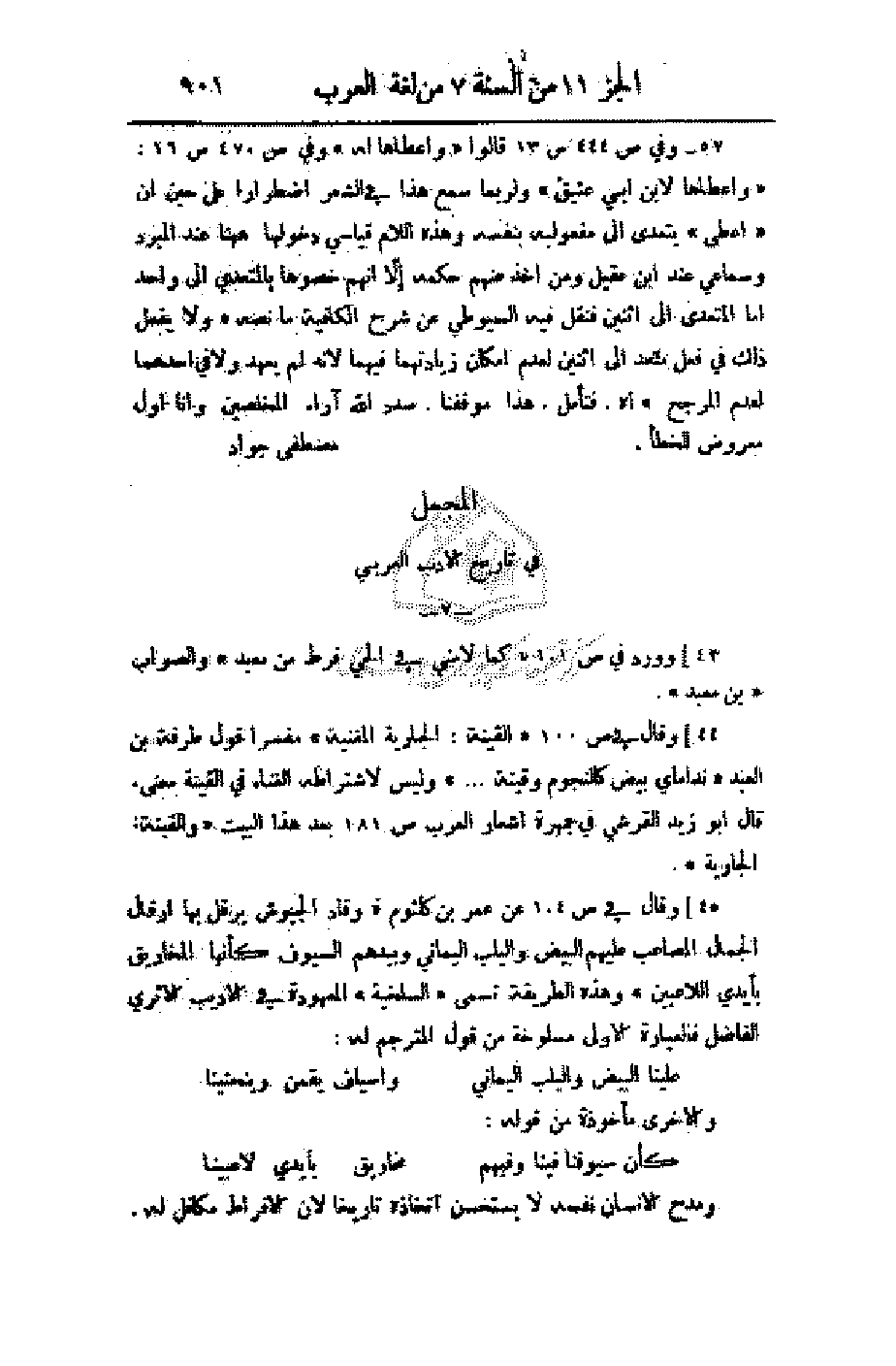 45) وقال في ص 104 عن عمر بن كلثوم (وقاد الجيوش يرقل بها أرقال الجمال المصاعب عليهم البيض واليلب اليماني وبيدهم السيوف كأنها المخاريق بأيدي اللاعبين) وهذه الطريقة تسمى (السلخية) المعهودة في الأدب الأثري الفاضل فالعبارة الأولى مسلوخة من قول المترجم له: