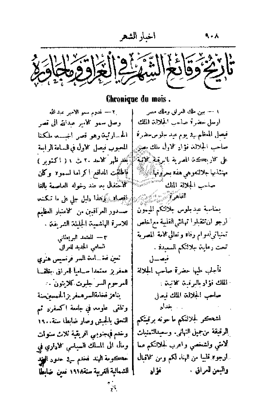 أرسل حضرة صاحب الجلالة الملك فيصل المعظم في يوم عيد جلوس حضرة صاحب الجلالة فؤاد الأول ملك مصر على الأريكة المصرية بالبرقية الآتية مهنئا بها جلالته وهي هذه بحروفها: