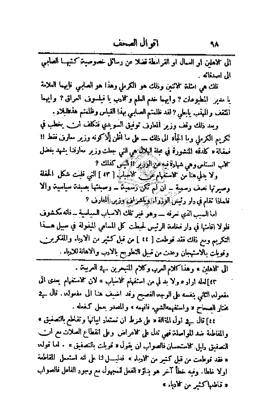 تلك هي أمثلة الاثنين وذلك هو الكرملي وهذا هو الصابي فأيهما العلامة يا مدير المطبوعات؟ وأيهما خدم العلم والأدب يا فيلسوف العراق؟ وأيهما المثقف والمهذب يا بطي؟ لقد ظلمتم الصابي بهذا القياس وظلمتم هذه البلاد.