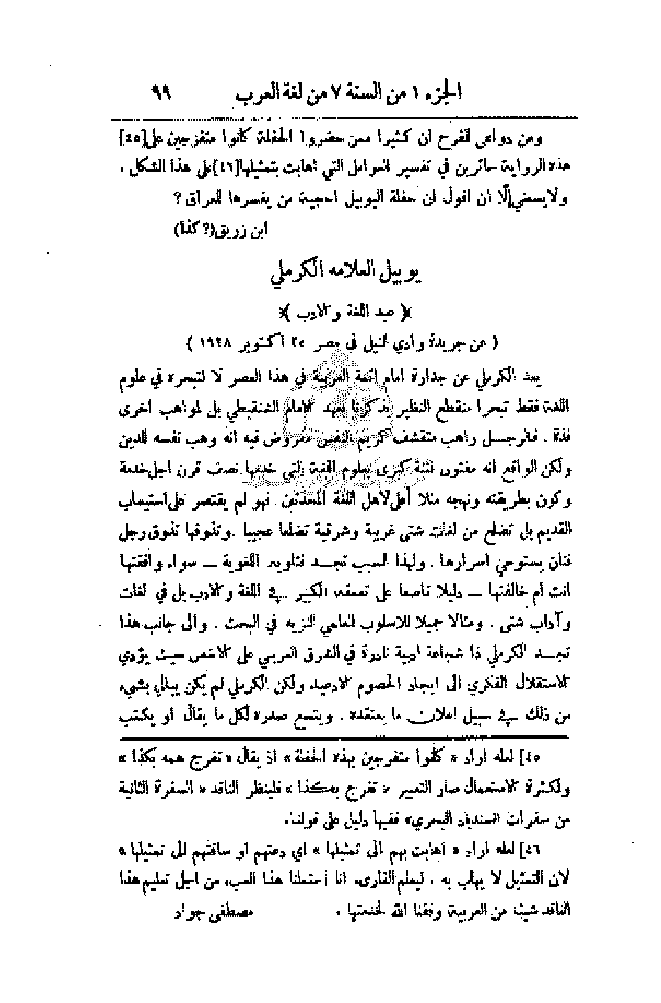 يعد الكرملي عن جدارة إمام أئمة العربية في هذا العصر لا لتبحره في علوم اللغة فقط تبحرا منقطع النظير يذكرنا بعهد الإمام الشنقيطي بل لمواهب أخرى فذة. فالرجل راهب متقشف كريم النفس مفروض فيه أنه وهب نفسه للدين ولكن الواقع أنه مفتون فتنة كبرى بعلوم اللغة التي خدمها نصف قرن أجل خدمة وكون بطريقته ونهجه مثلا أعلى لأهل اللغة المحدثين. فهو لم يقصر على استيعاب القديم بل تضلع من لغات شتى غربية وشرقية تضلعا عجيبا. وتذوقها تذوق رجل فنان يستوحي أسرارها. ولهذا السبب تجد فتاويه اللغوية - سواء وافقتها أنت أم خالفتها - دليلاً ناصعاً على تعمقه الكبير في اللغة والأدب بل في لغات وآداب شتى. ومثالا جميلا للأسلوب العلمي النزيه في البحث. وإلى جانب هذا نجد الكرملي ذا شجاعة أدبية نادرة في الشرق العربي على الأخص حيث يؤدي الاستقلال الفكري إلى إيجاد الخصوم الأدعياء ولكن الكرملي لم يكن يبالي بشيء من ذلك في سبيل إعلان ما يعتقده. ويتسع صدره لكل ما يقال أو يكتب