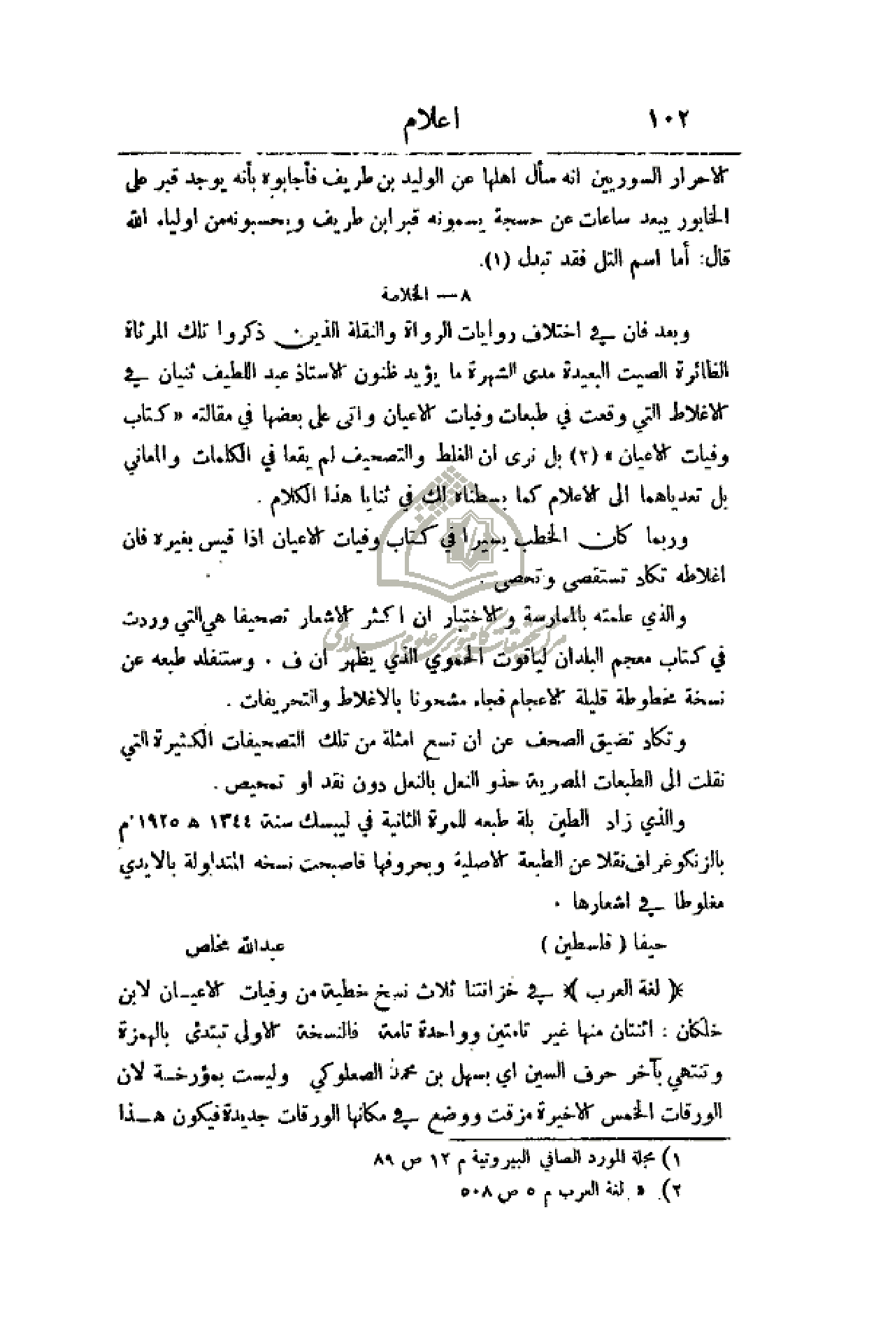 (لغة العرب) في خزانتنا ثلاث نسخ خطية من وفيات الأعيان لأبن خلكان: اثنتان منها غير تامتين وواحدة تامة فالنسخة الأولى تبتدئ بالهمزة وتنتهي بآخر حرف السين أي بسهل بن محمد الصعلوكي وليست بمؤرخة لأن الورقات الخمس الأخيرة مزقت ووضع في مكانها الورقات جديدة فيكون هذا
