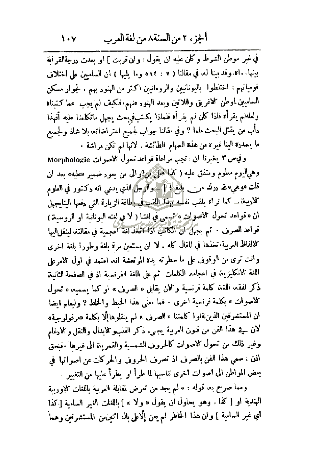 وفي ص 3 يخبرنا أن: تجب مراعاة قواعد تحول الأصوات وهي اليوم معلوم ومتفق عليه (كذا فعلى من؟ وإلى من يعود ضمير (عليه) بعد أن قلت (وهي) لله درك من بليغ!) - والرجل الذي يدعي أنه دكتور في العلوم الأدبية - كما نراه يلقب نفسه بهذا اللقب في بطاقة الزيارة التي دفعها إلينا يجهل أن (قواعد تحول الأصوات) تسمى في لغتنا (لا في لغته اليونانية أو الروسية) قواعد الصرف، ثم يجهل أن الكاتب إذا أتخذ لغة أعجمية في مقالته لينقل إليها الألفاظ العربية اتخذها في المقالة كله، لا أن يستعين مرة بلغة وطورا بلغة أخرى وأنت ترى من الوقوف على ما سطرته يده المرتعشة أنه أعتمد في أول الأمر على اللغة الإنكليزية في اعجامه الكلمات ثم على اللغة الفرنسية إذ في الصفحة الثانية ذكر لفقه اللغة كلمة فرنسية والآن يقابل (الصرف) أو كما يسميه (تحول الأصوات) بكلمة فرنسية أخرى. فما معنى هذا الخبط والخلط؟ وليعلم أيضاً أن المستشرقين الذين نقلوا كلمتنا (الصرف) لم ينقلوها إلا بكلمة (مرفولوجية) لأن في هذا الفن من فنون العربية يجيء ذكر القلب والإبدال والنقل والإدغام وغير ذلك من تحول الأصوات كالحروف الشمسية والقمرية إلى غيرها. فبحق إذن: سمي هذا الفن بالصرف إذ بالصرف إذ تصرف الحروف والحركات عن أصواتها في بعض المواطن إلى أصوات أخرى تناسبها لما طرأ أو يطرأ عليها من التغيير.