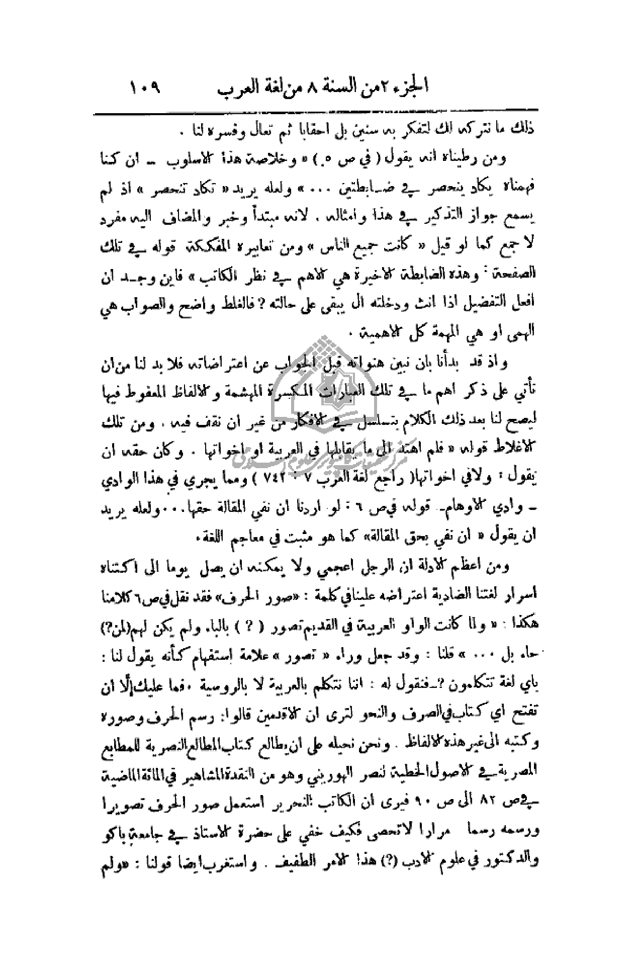 وإذ قد بدأنا بأن نبين هنواته قبل الجواب عن اعتراضاته فلا بد لنا من أن نأتي على ذكر أهم ما في تلك العبارات المكسرة المهشمة والألفاظ المعفوط فيها ليصح لنا بعد ذلك الكلام بتسلسل في الأفكار من غير أن نق فيه. ومن تلك الأغلاط قوله (فلم أهتد إلى ما يقابلها في العربية أو أخواتها. وكان حقه أن يقول: ولا في أخواتها (راجع لغة العرب 7: 742) ومما يجري في هذا الوادي - وادي الأوهام - قوله في ص 6: لو أردنا أن نفي المقالة حقها. . . ولعله يريد أن يقول (أن نفي بحق المقالة) كما هو مثبت في معاجم اللغة.